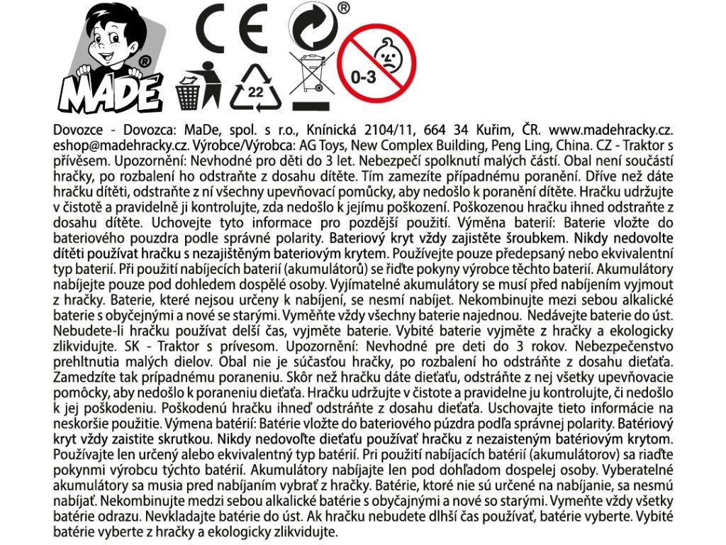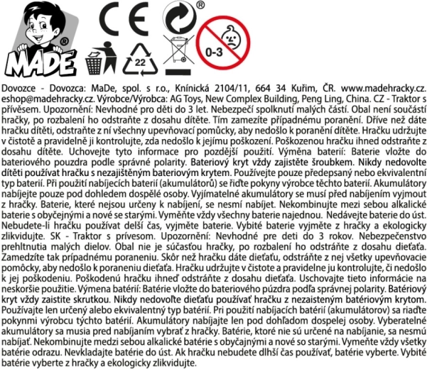 De tractor is direct klaar voor gebruik, want 3 AG13-batterijen zijn inbegrepen. Dankzij de compacte afmetingen past hij gemakkelijk in kinderhanden en is hij geschikt om thuis en onderweg mee te spelen.