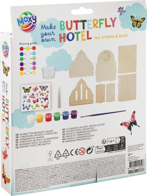 Ontdek het plezier van creëren en help de vlinders in je tuin. Met de set MOXY houten vlinderhotel kunnen zowel kinderen als volwassenen een eigen huisje van licht balsa hout in elkaar zetten en beschilderen. Met de meegeleverde acrylverf kun je een uniek ontwerp maken dat prachtig in de buitenruimte past.