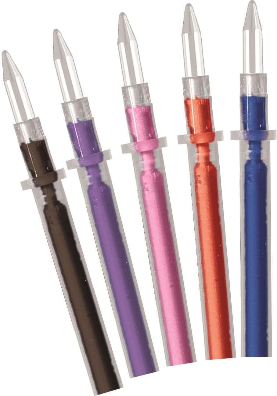 - 5 personaliseeerbare pennen: transparante penlichamen, inktvullingen, doppen en eindstukken.