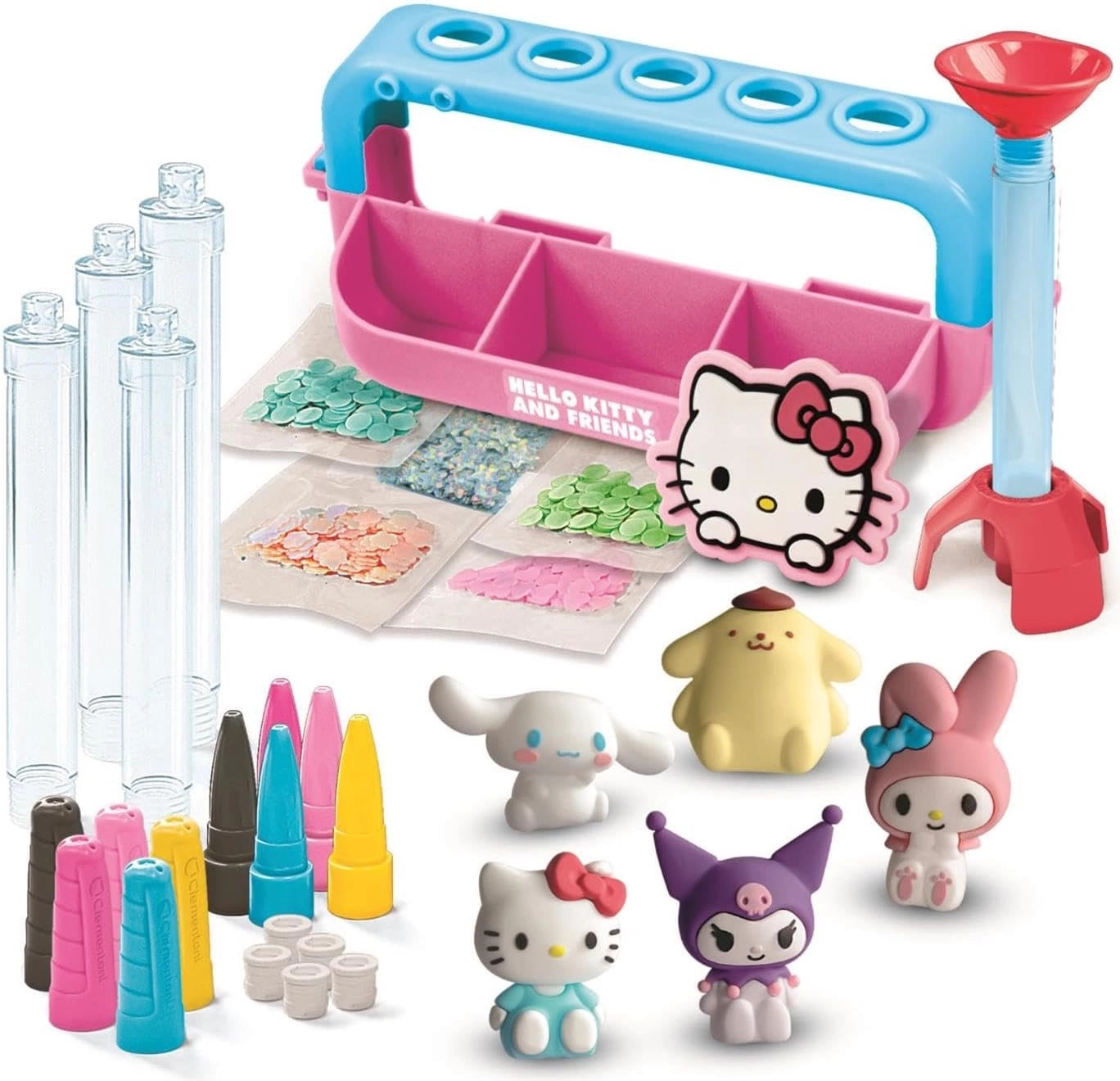 Maak van knutselen een magische ervaring met deze set waarmee kinderen vijf originele pennen kunnen maken. De transparante penlichamen kunnen worden gevuld met glitters, confetti en kralen, versierd met stickers en afgewerkt met rubberen HELLO KITTY & Friends figuurtjes. Alles is overzichtelijk geordend in een praktische werkbank met organizer.