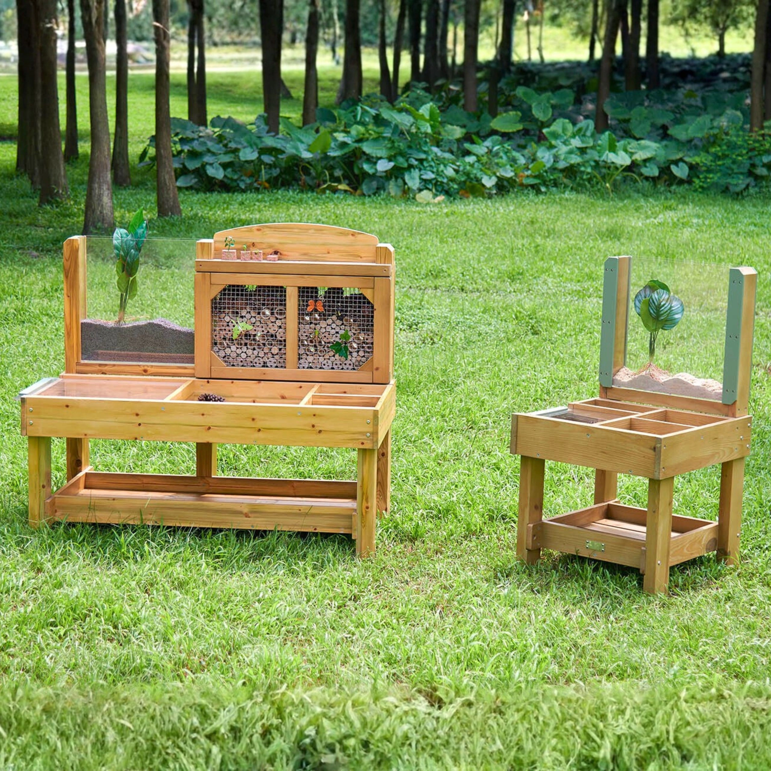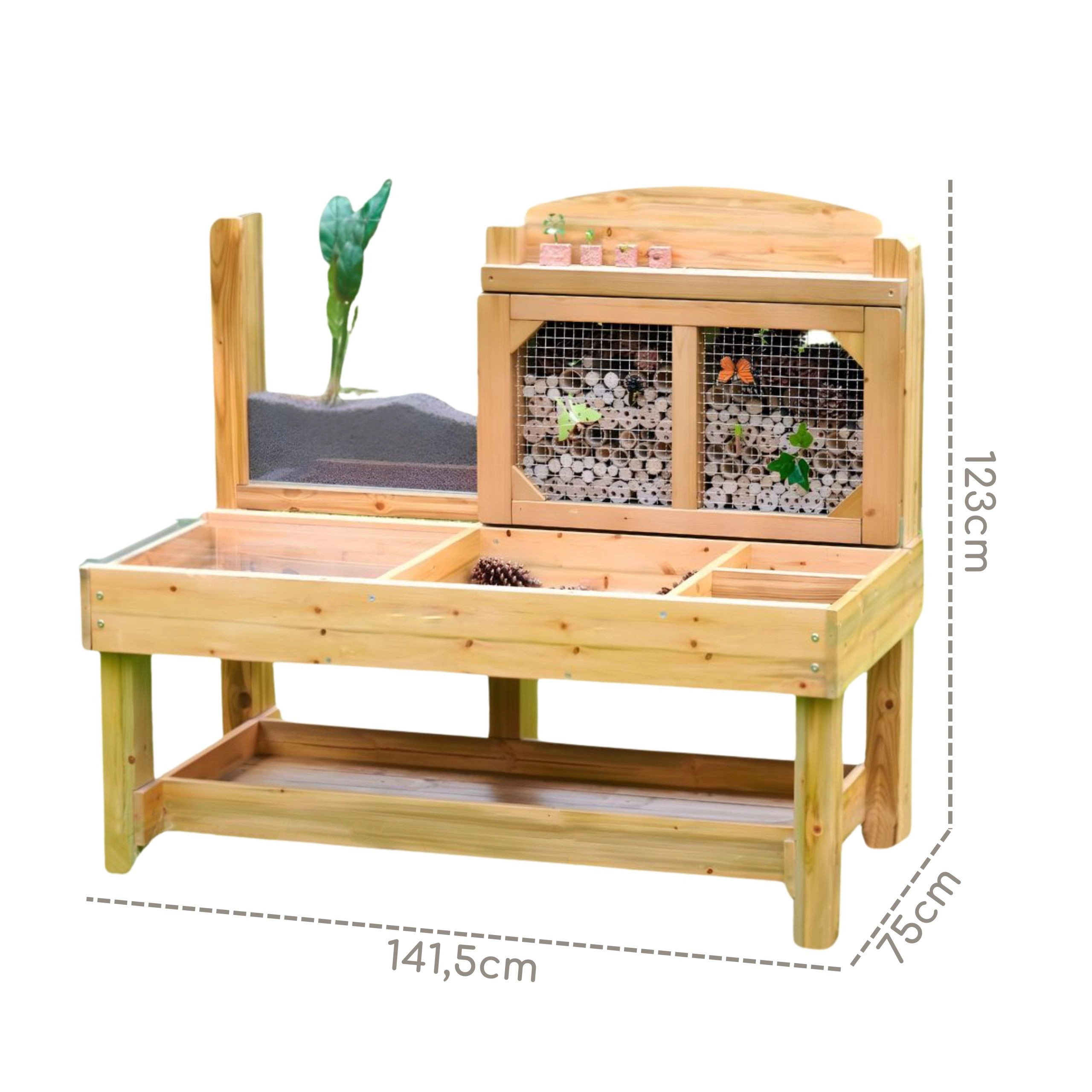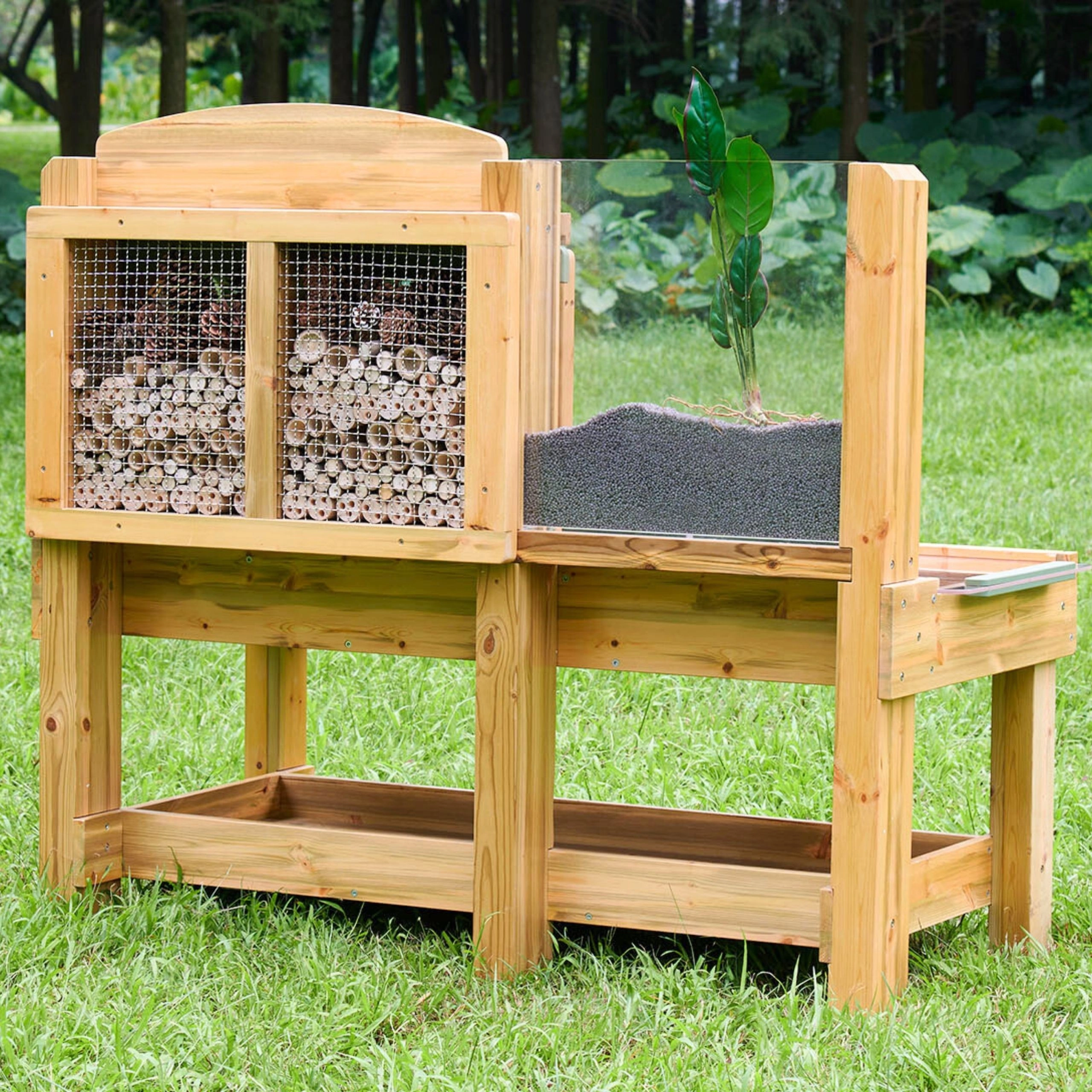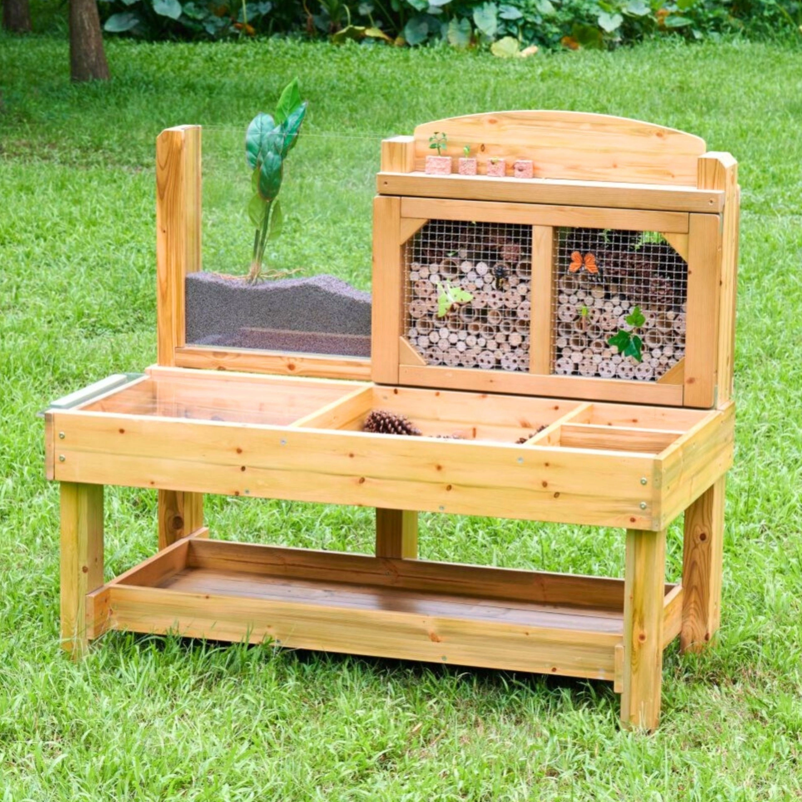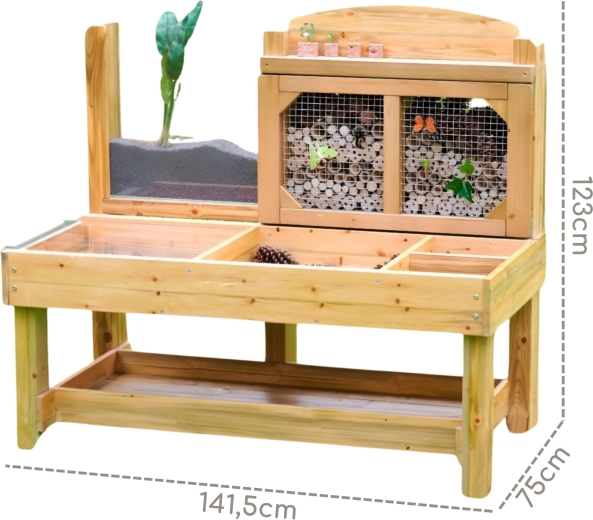Er is een achterpaneel met bamboebuisjes achter een metalen rooster, dat dient als een natuurlijk insectenhotel, en een acryl wortelpaneel om de groei van planten en de beweging van bodemdieren te volgen. De constructie van geïmpregneerd hout is bestand tegen vocht, schimmel en UV, waardoor hij ideaal is voor het hele jaar door buiten ontdekken.