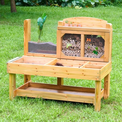 Het gedeelte met bamboebuisjes en houten blokken achter metalen gaas creëert aantrekkelijke schuilplaatsen voor nuttige insecten en laat kinderen hun levenscyclus observeren.
