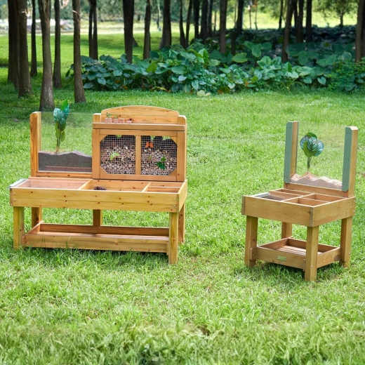 De praktische tuin-observatietafel van Masterkidz is ontworpen om de aandacht van kinderen op de natuur te vestigen. Hij biedt meerdere zones voor het verzamelen en sorteren van natuurlijke materialen, transparante uitneembare bakjes voor eenvoudig onderzoek van monsters en een grote kamer met transparant deksel voor het veilig observeren van levende wezens.