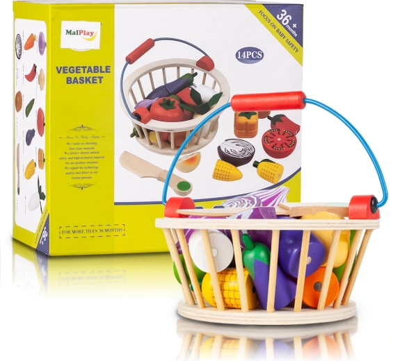 Ontdek creatief speelplezier voor kleine koks: houten mand met snijgroenten met magneten voor eenvoudig verbinden. De set bevat een mand, kinderveilige mes en groenten in helften die dankzij twee magneten weer aan elkaar klikken. Ideaal voor het ontwikkelen van fijne motoriek, het leren van kleuren en vormen en kookrollenspel vanaf 3 jaar.