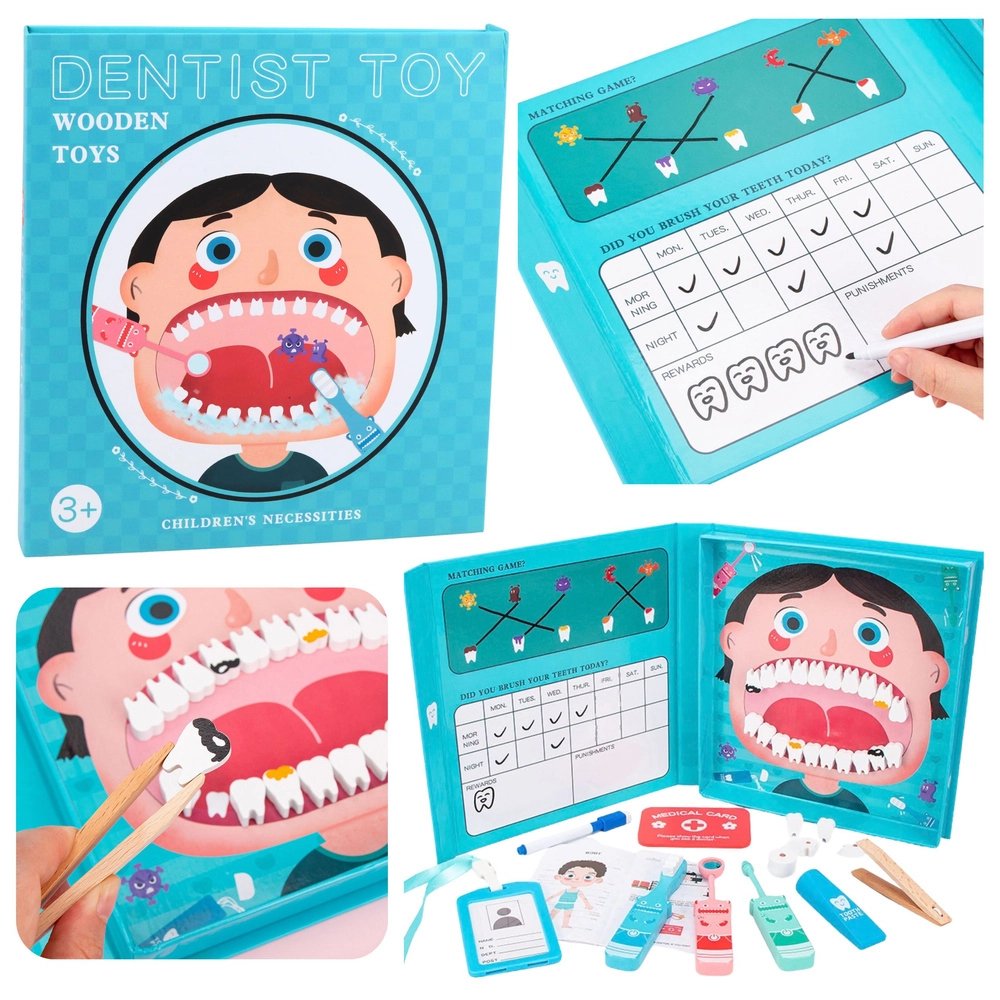 Ontdek een leuke en leerzame manier om kinderen kennis te laten maken met mondverzorging – een houten tandartsset in de vorm van een magnetisch boek. Dankzij de realistische accessoires en maar liefst 24 tanden oefenen kleine tandartsen mondhygiëne, overwinnen ze angst voor de tandartspraktijk en ontwikkelen ze zowel fijne motoriek als creativiteit.