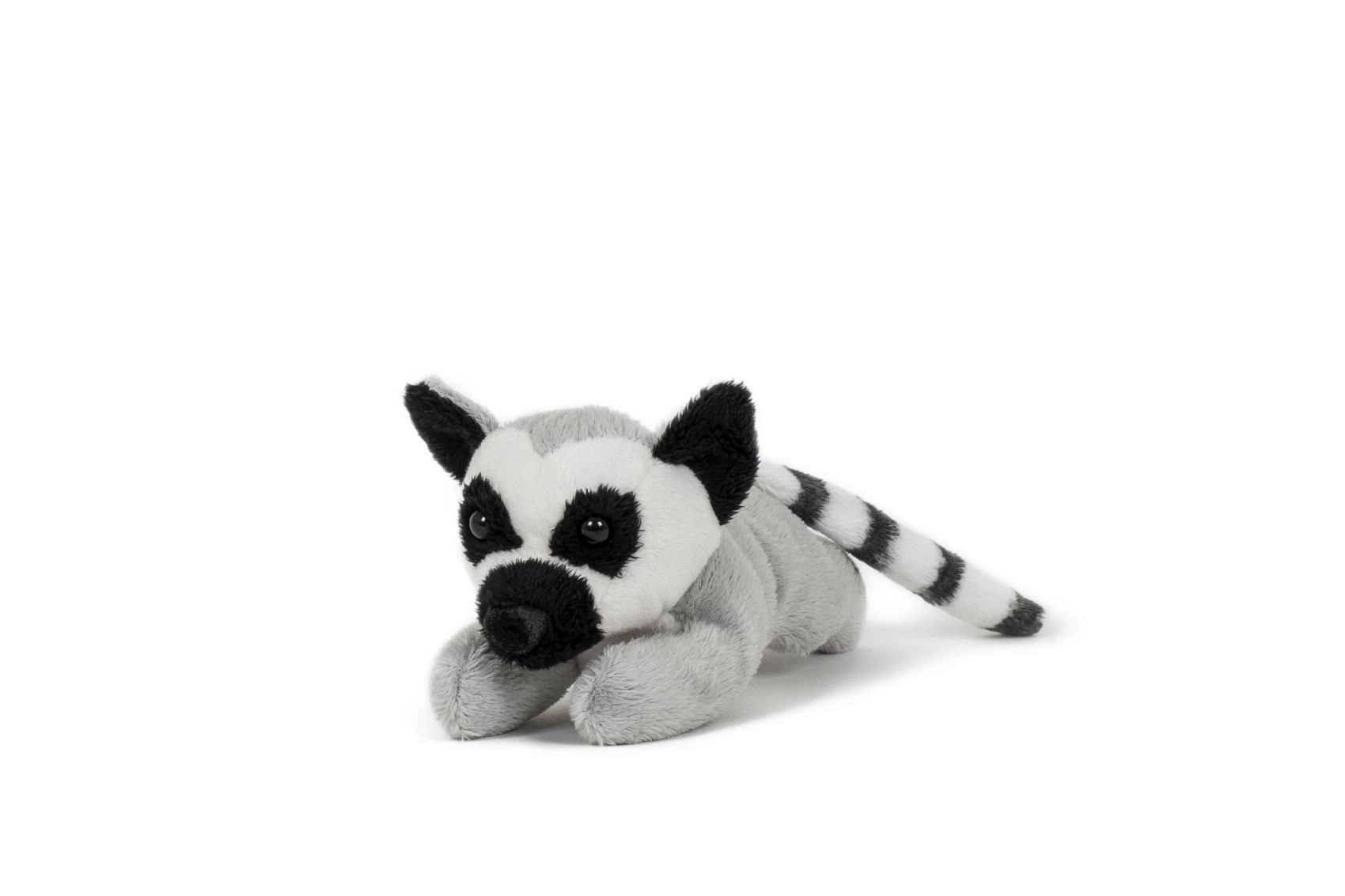Schattige pluchen ringstaartmaki in liggende positie met het kenmerkende zwart-witte kleurpatroon en een lange gestreepte staart. Dankzij het realistische design, het zachte en soepele materiaal en de vriendelijke uitstraling wordt het snel een favoriete knuffel- en speelkamerad, thuis én onderweg.