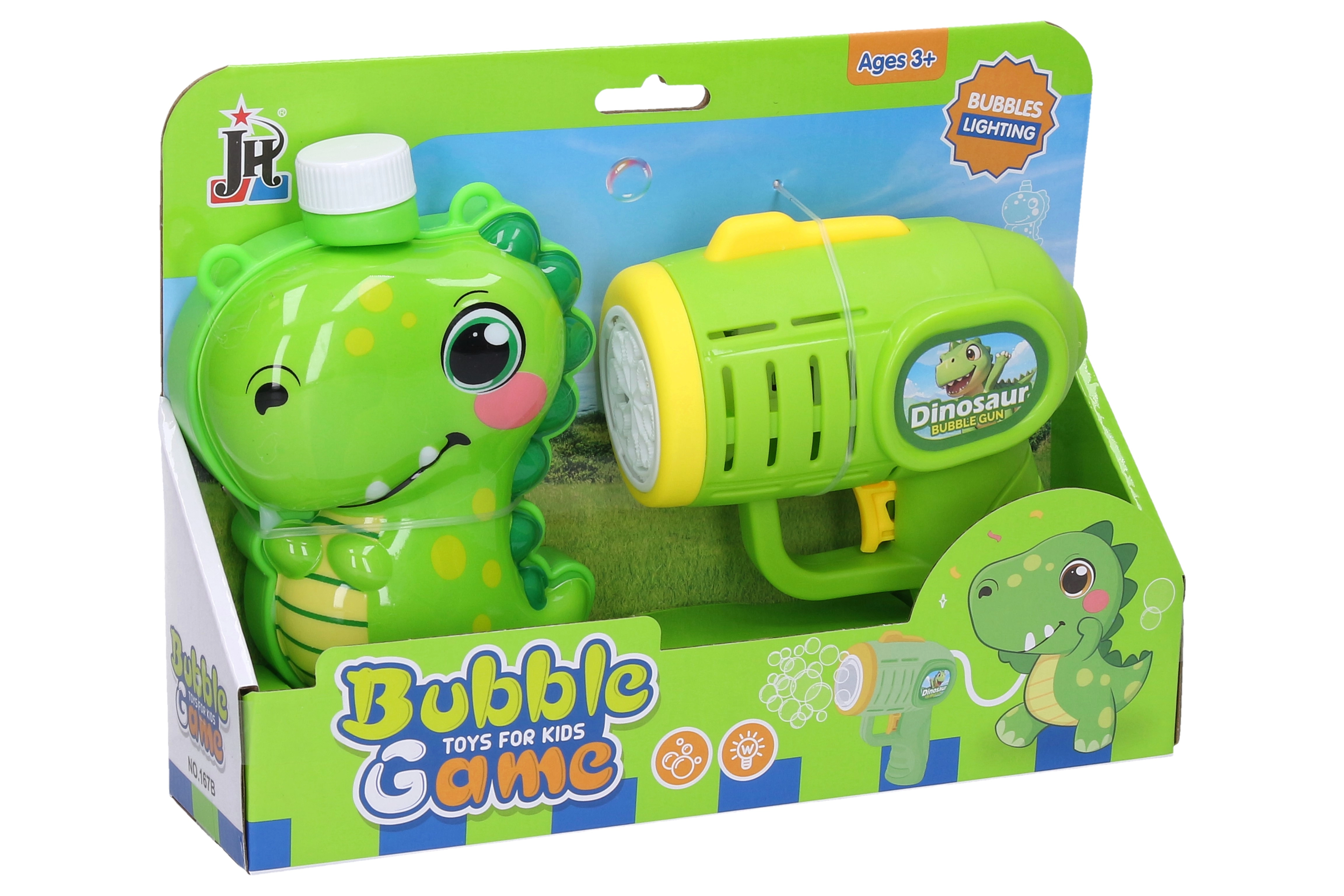 Ontketen het bellenplezier met dit bellenblaaspistool in dinosaurusvorm! Dankzij de externe tank met een inhoud van 280 ml genieten kinderen lange tijd van onafgebroken bellen zonder vaak bij te vullen. Plaats de batterijen, vul de tank en druk op de knop – het pistool blaast automatisch een groot aantal bellen.