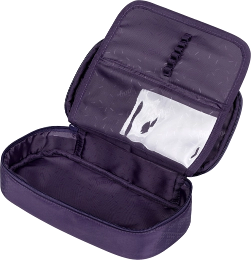 Ruime etui met dubbele uitklapflap en binnenvak (zonder inhoud) en een lichte gymsack van afwasbaar materiaal voor schoenen of hobby’s.