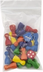 In de verpakking zitten ook twee standaard dobbelstenen, zodat je alles hebt om direct te spelen. De compacte zipzak van 7×13 cm houdt pionnen en dobbelstenen bij elkaar en is handig voor onderweg.