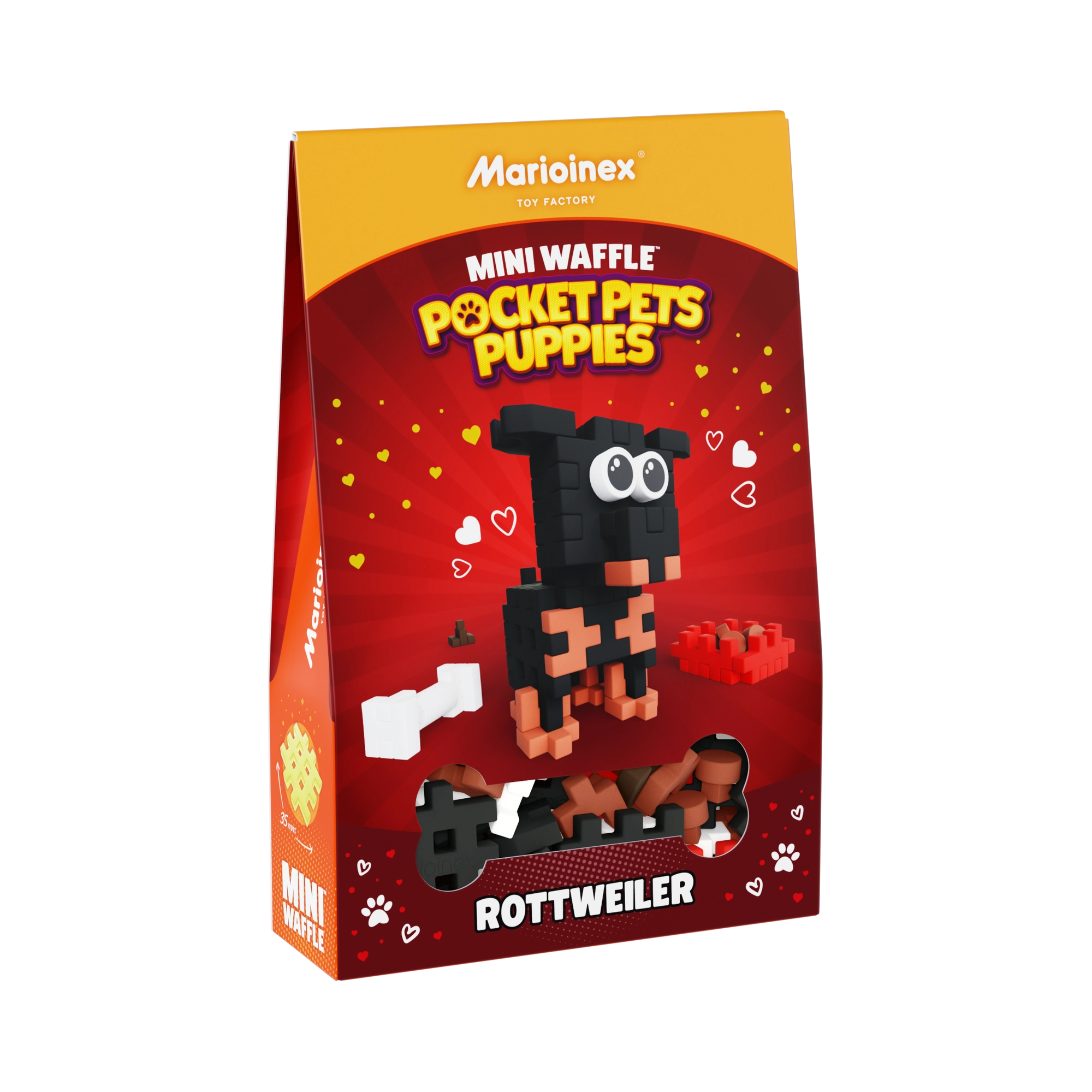 Ontdek de leuke bouwset MARIOINEX Mini Waffle Pocket Pets met het motief van een schattige rottweiler. In de compacte verpakking vind je 50 kleurrijke onderdelen om een hondenfiguur en accessoires te bouwen – een bak met brokjes, een bot en een drolletje. De onderdelen klikken gemakkelijk in elkaar, zijn flexibel, duurzaam en veilig, zodat kinderen in 2D en 3D kunnen bouwen en zo creativiteit, fijne motoriek en logisch denken ontwikkelen.