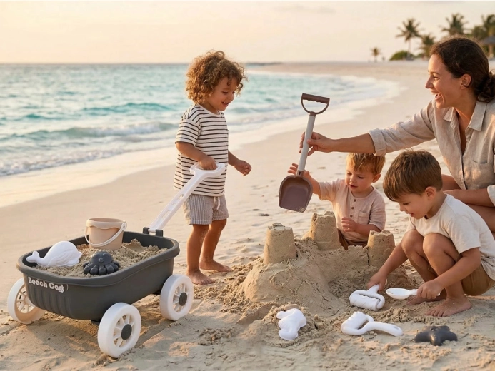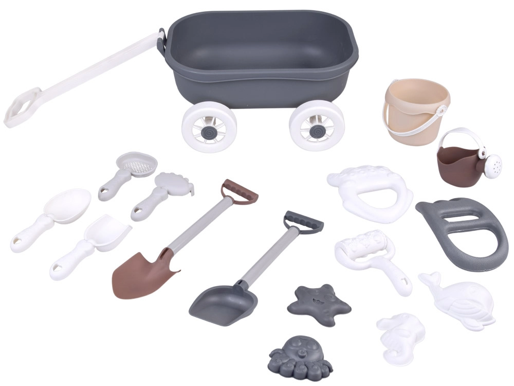 Een stijlvolle zandset met een praktisch wagentje biedt kinderen eindeloos speelplezier op het strand, in de tuin en in de zandbak. Bevat maar liefst 16 stuks in moderne neutrale kleuren, inclusief een trekwagentje, emmer, gieter, scheppen en harken, een zeef en zeevormpjes. Het duurzame kunststof en de brede wielen maken het vervoeren van speelgoed en zand eenvoudig, terwijl kinderen hun creativiteit, fijne motoriek en plezier in buitenspelen ontwikkelen.