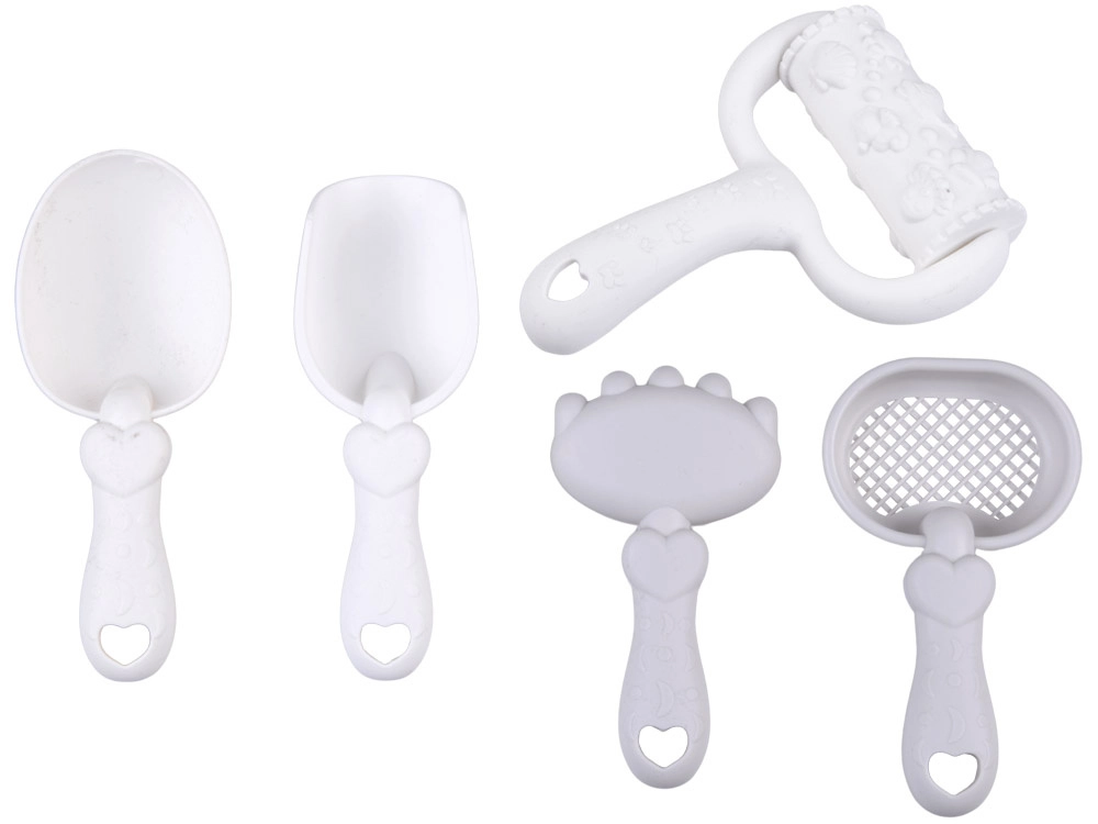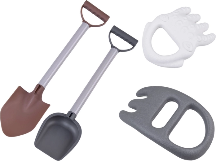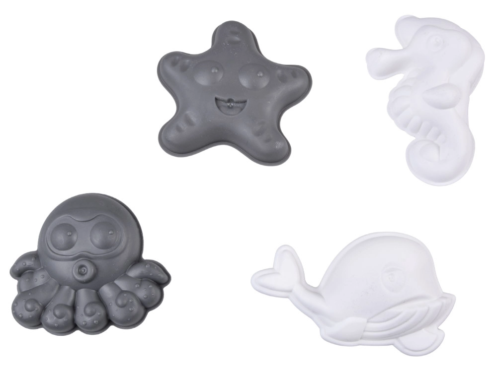 De set bevat alles wat nodig is voor fantasierijk spel: 2 grote scheppen (spade en schop), 2 kleinere schepjes, een hark en grijphark voor grover en fijner werk in het zand, een zeef om te zeven, een emmer, een gieter om te begieten en een wals met zeeprint. Het vormgeven wordt aangevuld met vormpjes van zeedieren – zeester, walvis, octopus en zeepaardje.