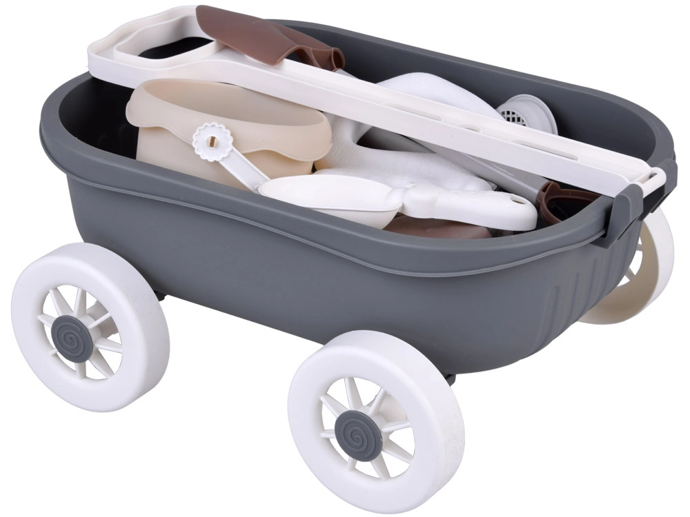 De elegante zandset is ideaal voor kleine bouwers die graag kastelen, tunnels en zandvormen maken. Dankzij de robuuste kar met handgreep verplaatsen kinderen moeiteloos alle accessoires en materialen naar de plek waar ze aan het spelen zijn. De neutrale kleurstelling in tinten grijs, wit en beige oogt strak en modern.