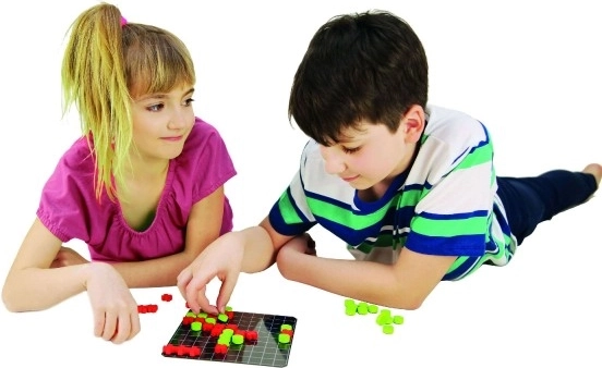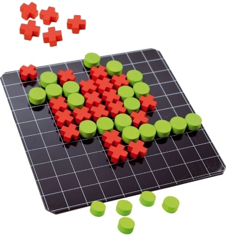 Het spel bevat houten speelstukken in de vorm van rondjes Ø 1,5 cm en kruisjes 1,5x1,5 cm. Alle stukken zijn voorzien van een magneet, wat het gebruik op het bord vergemakkelijkt.