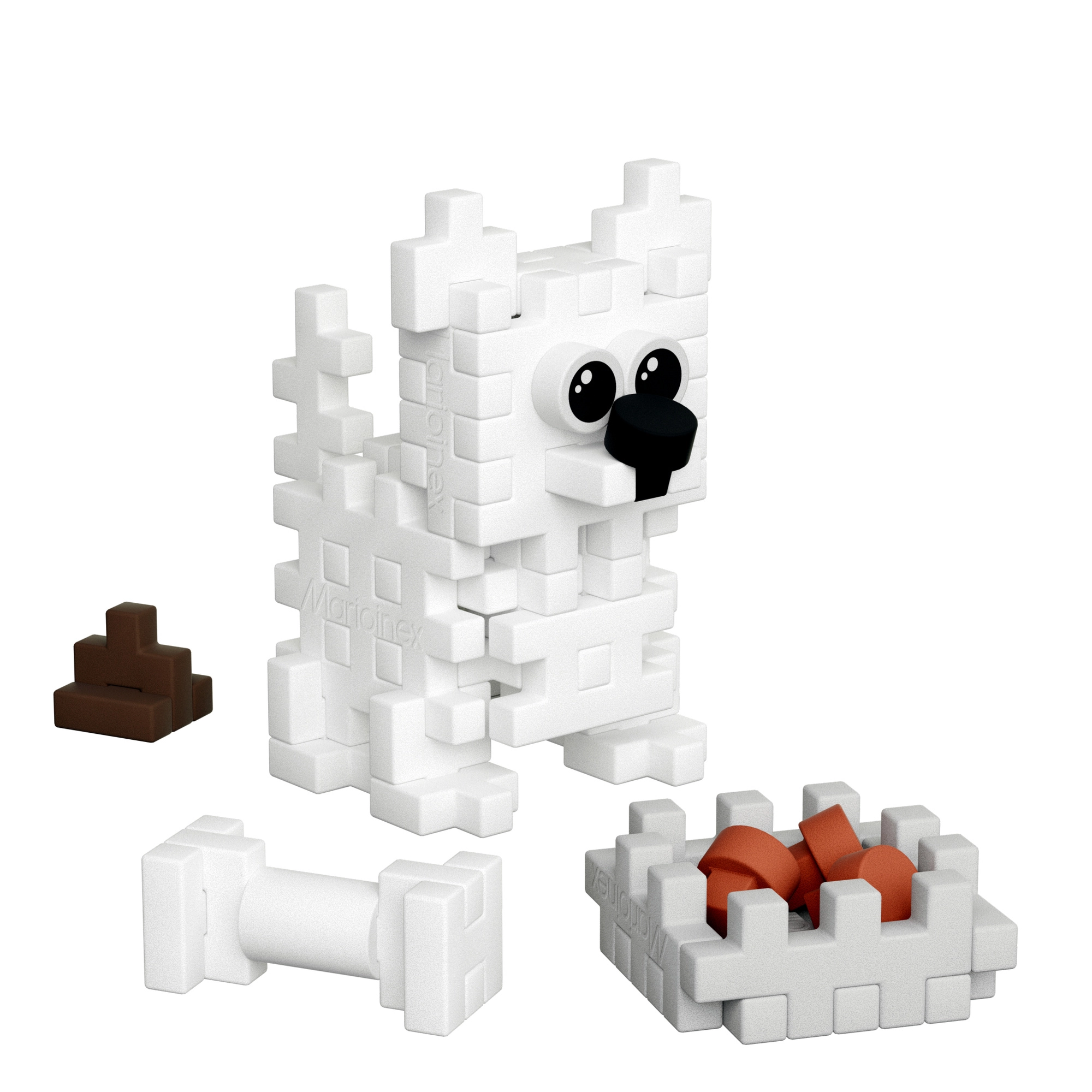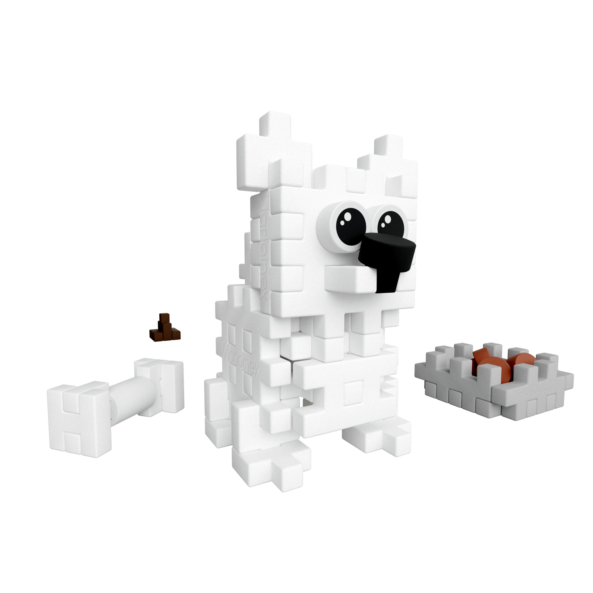 De compacte bouwset Mini Waffle Pocket Pets van het merk Marioinex brengt een schattige Westie met accessoires. In de verpakking vind je 49 kleurrijke onderdelen, waarmee je een hondje en accessoires bouwt (een voerbak, bot en drolletje). De steentjes klikken makkelijk in en uit elkaar, zijn flexibel, duurzaam en veilig, en stimuleren creativiteit, fijne motoriek en logisch denken.
