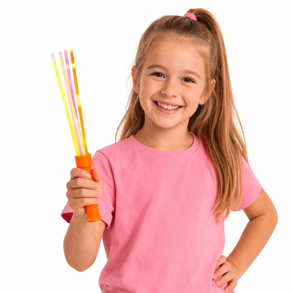 Creëer een opvallend lichteffect met een stok waarin je tegelijk tot 6 glowstick-staafjes kunt plaatsen. Activeren gaat eenvoudig door te buigen, waarna de staafjes helder neonlicht uitstralen dat zichtbaar is in het donker – zonder batterijen of opladen.