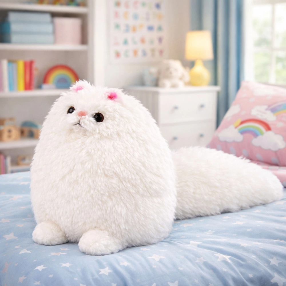 Deze witte pluchen kat valt op door zijn ronde, donzige vorm en extra lange staart, die het speelgoed een uniek charisma geeft. De zachte pluche nodigt uit om te knuffelen en biedt maximaal comfort tijdens slaap en ontspanning.