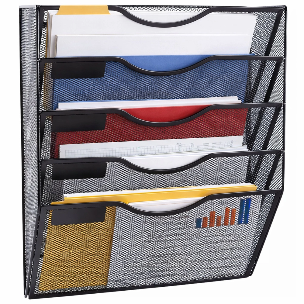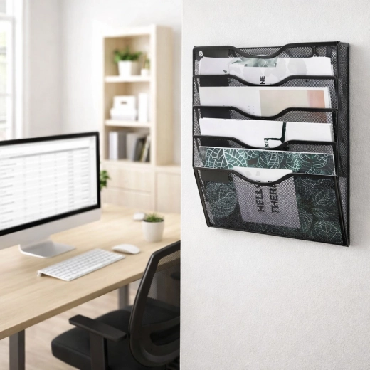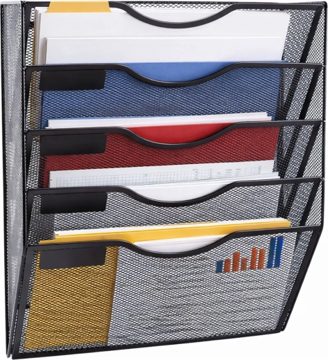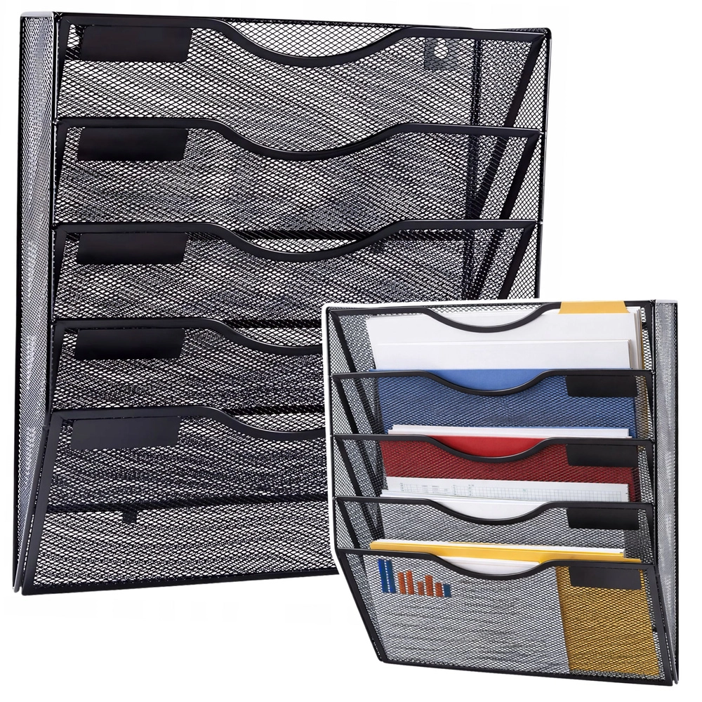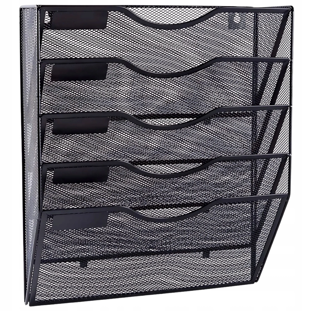 Bespaar bureauruimte en houd alles binnen handbereik met deze wandorganizer van metalen gaas. Hij biedt 5 ruime vakken voor A4-formaat, een duurzame, poedergecoate constructie en labelhouders voor snelle identificatie – ideaal voor het sorteren van documenten, post en tijdschriften.