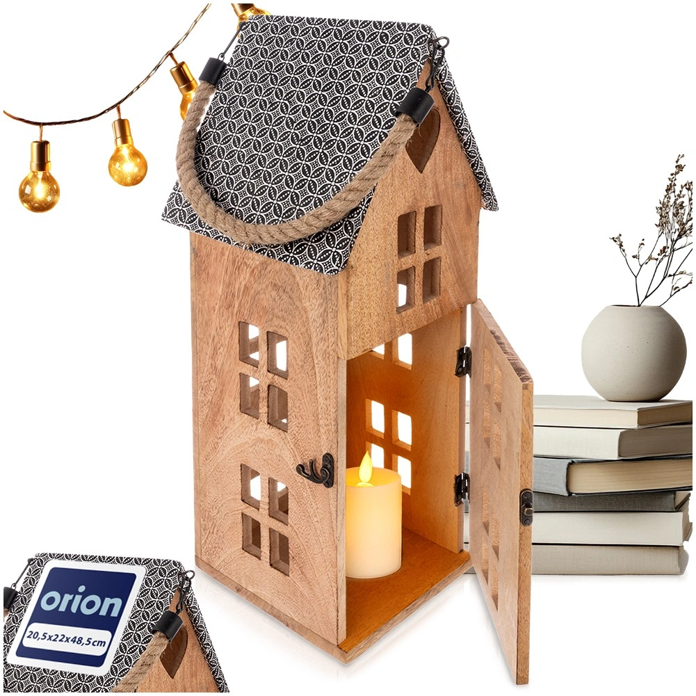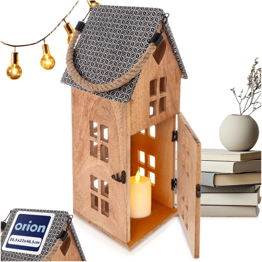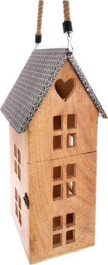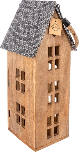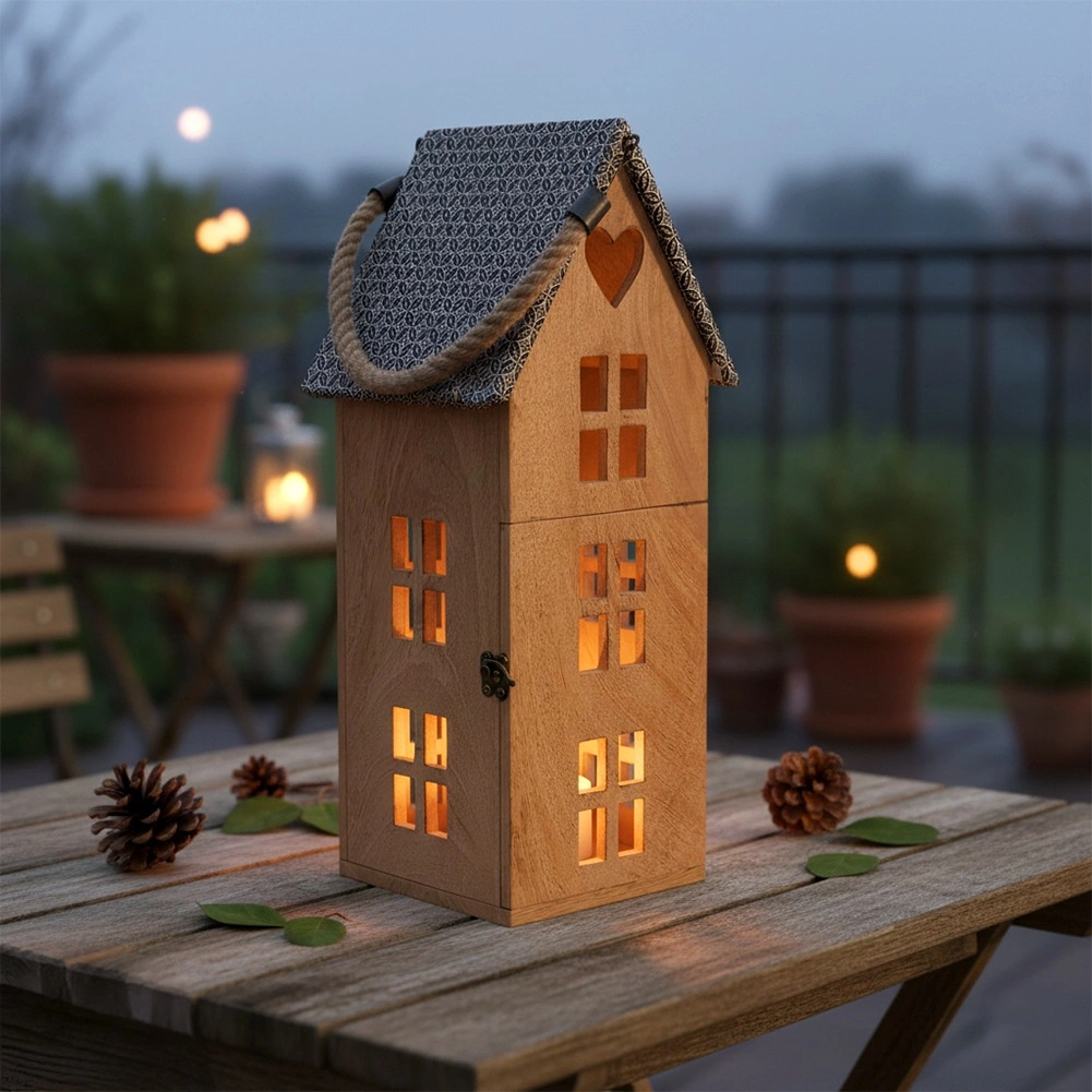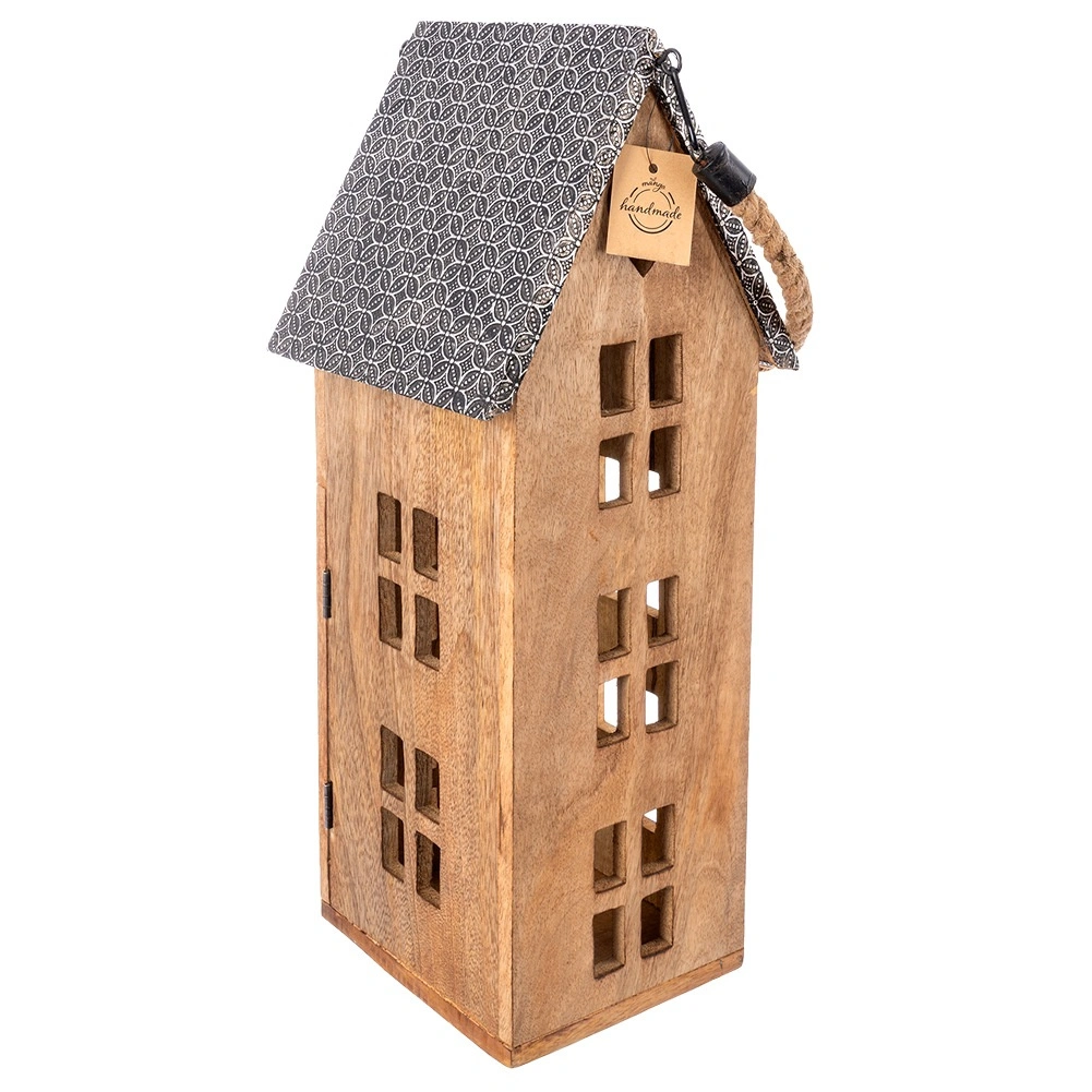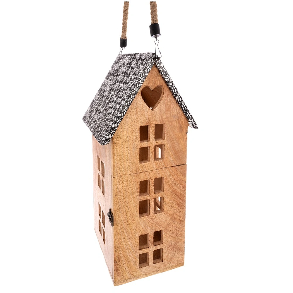 Stijlvolle lantaarn in de vorm van een huisje van mangohout met metalen dak en een robuust touwhandvat. Ontworpen voor veilig gebruik met een LED-kaars, geschikt om op te hangen of neer te zetten. Biedt gezellig, sfeervol licht, een natuurlijke uitstraling en weerstand tegen vocht. Ideaal voor de woonkamer, slaapkamer, terras of balkon.
