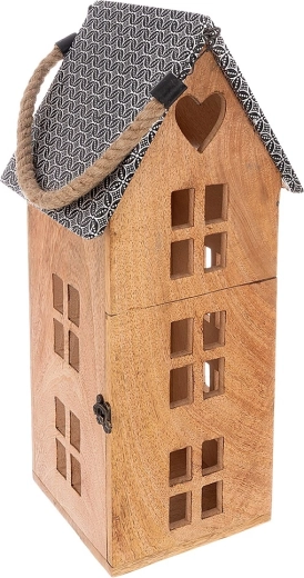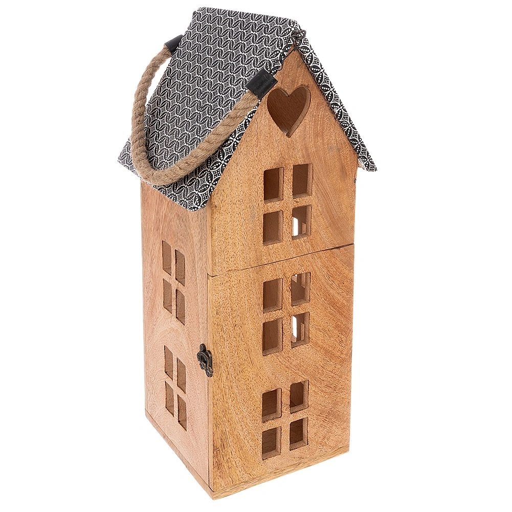 Ontdek de charme van warm licht met deze houten lantaarn in de vorm van een huisje. Handgemaakt van mangohout met natuurlijke nerf, aangevuld met een metalen dak en een sterk touwhandvat voor eenvoudig dragen of ophangen. Dankzij de raamuitsparingen ontstaat ’s avonds een indrukwekkend lichteffect dat elke ruimte verandert in een knusse plek om te ontspannen.
