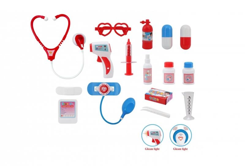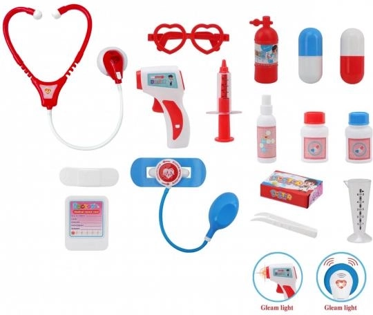De set bevat essentiële hulpmiddelen, zoals een stethoscoop met hartslaggeluid, een oplichtende thermometer, een injectiespuit, bril, spiegeltje en doosjes met “medicijnen” (speelgoed). Alles is opgeborgen in een stevige, draagbare koffer die dient als praktische opbergruimte.