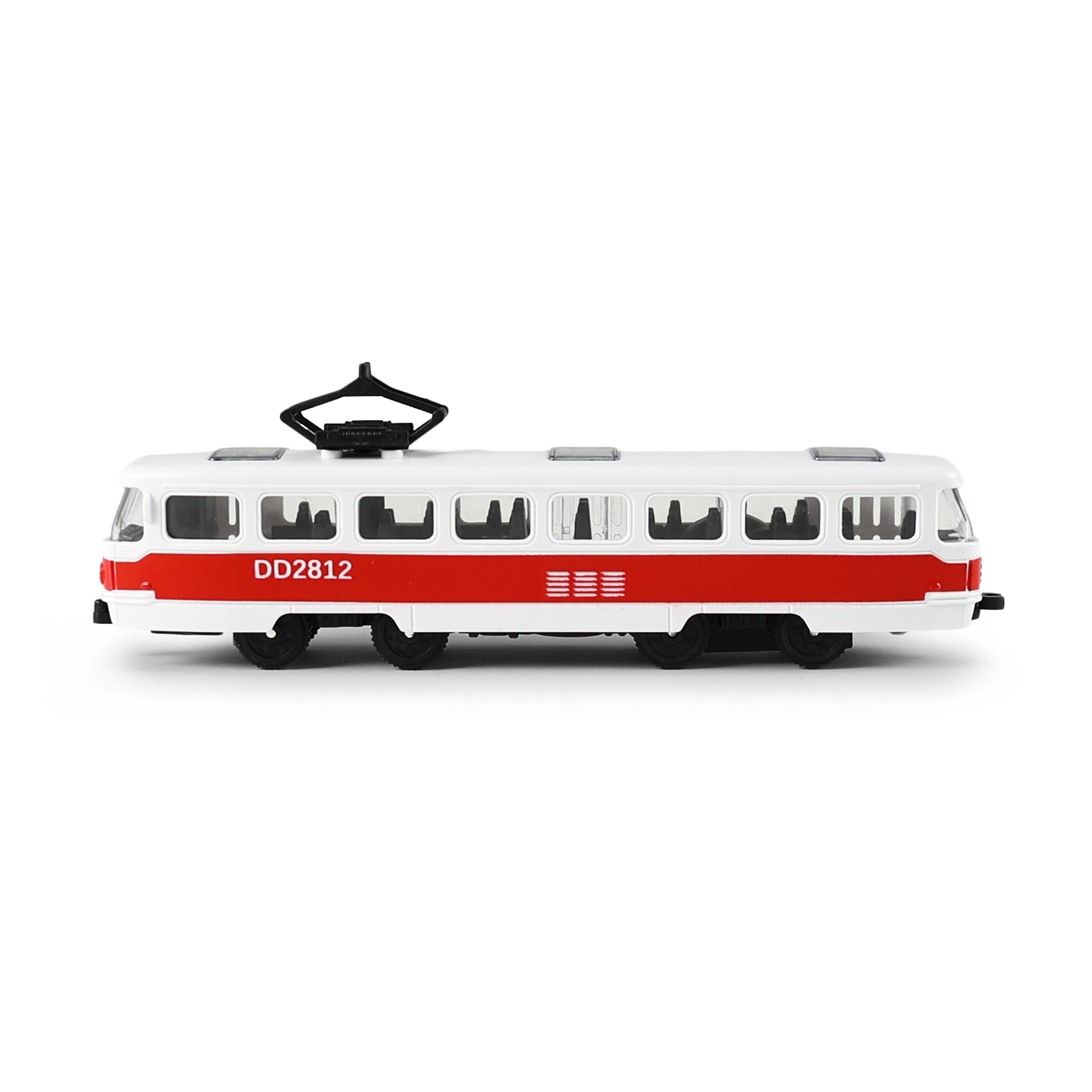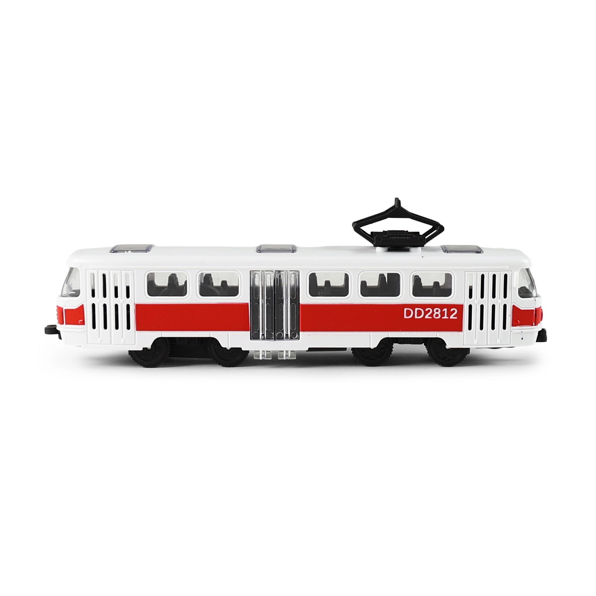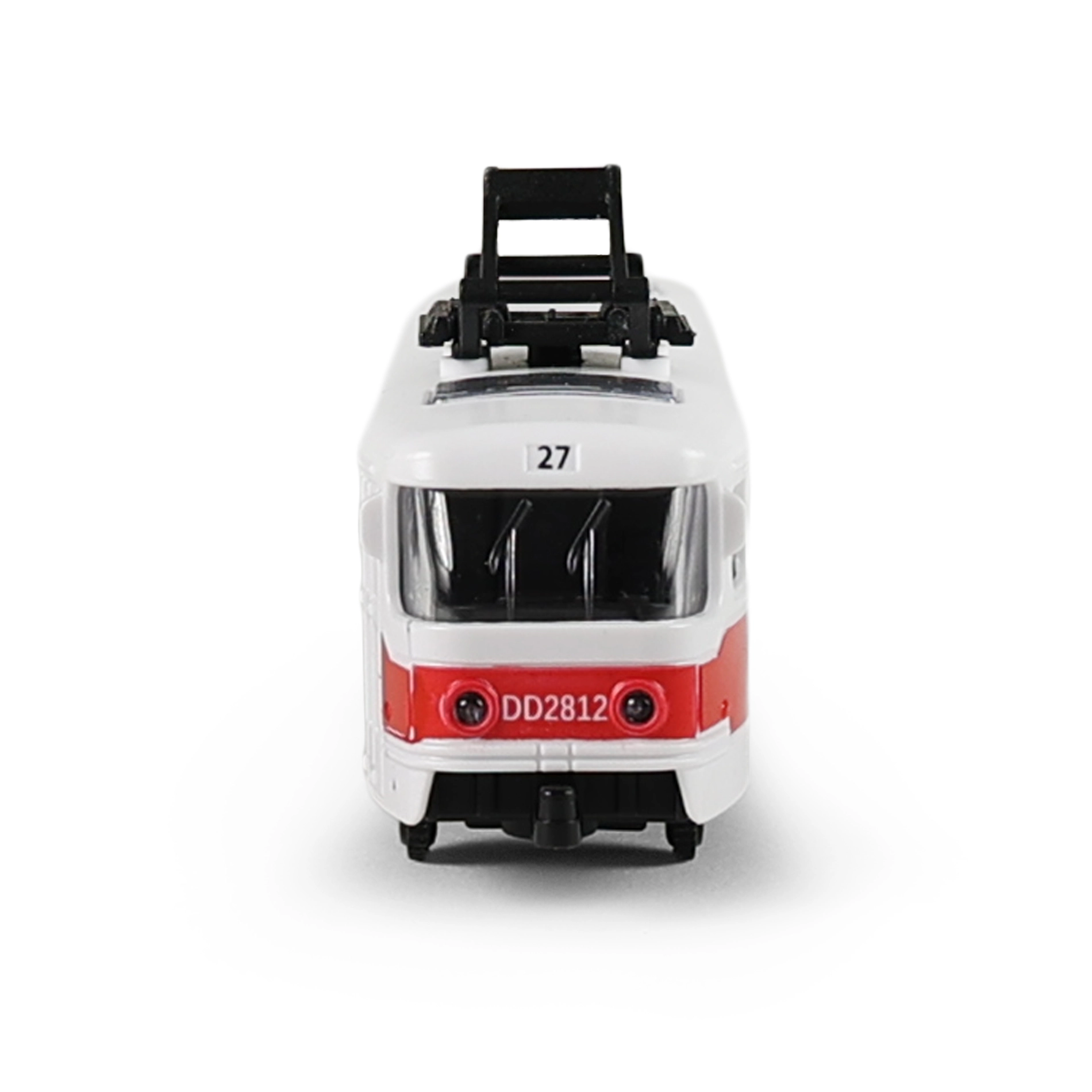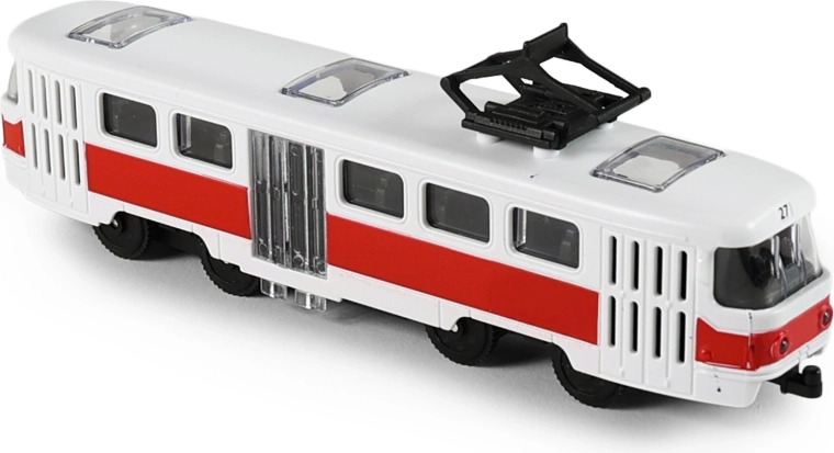 Realistische rood-witte tram met gedetailleerde afwerking van ramen, deuren en dakstroomafnemer is een geweldige aanvulling op het wagenpark van kinderen. Dankzij het compacte formaat van 16 cm ligt hij goed in de kinderhand en is hij ideaal voor spelen thuis en onderweg.