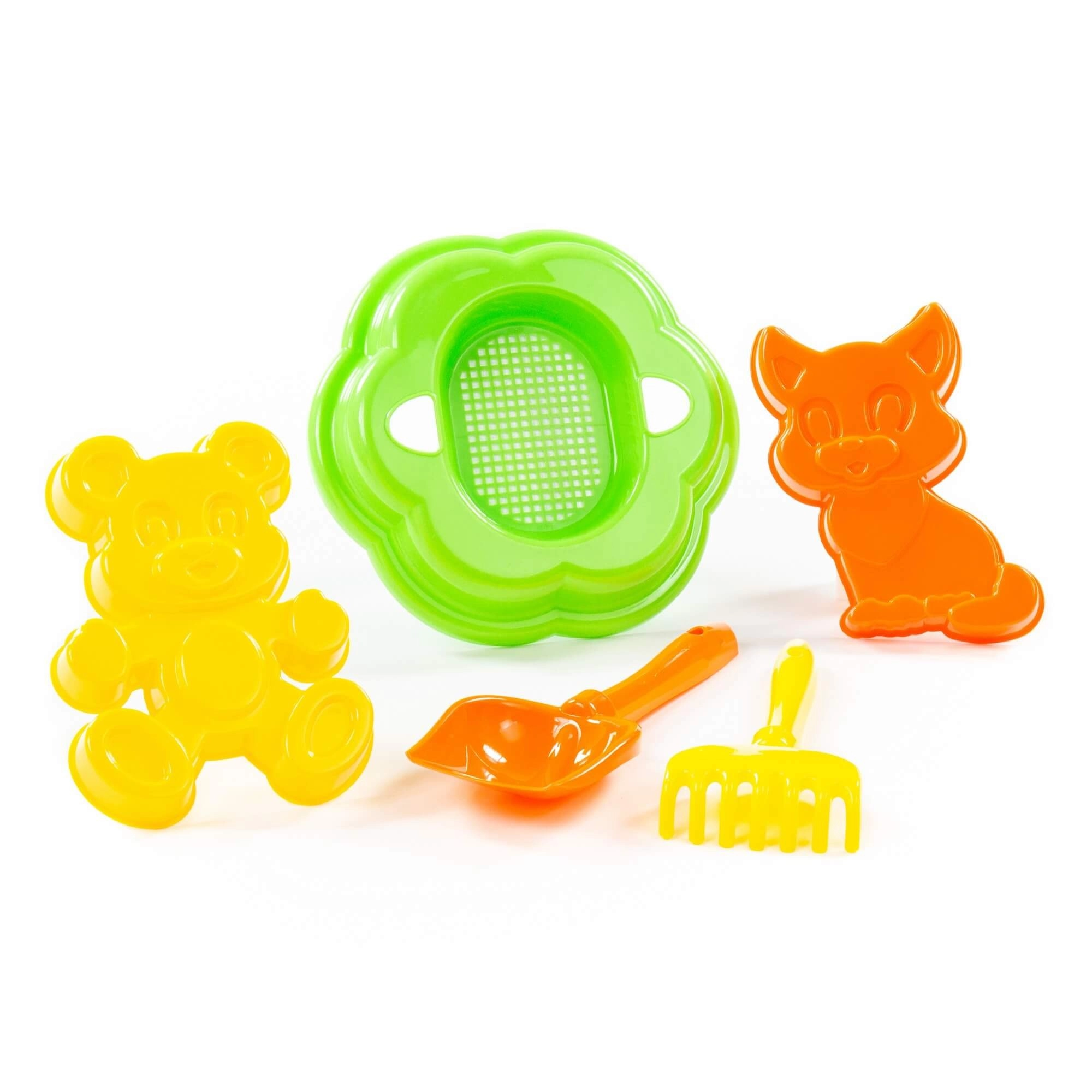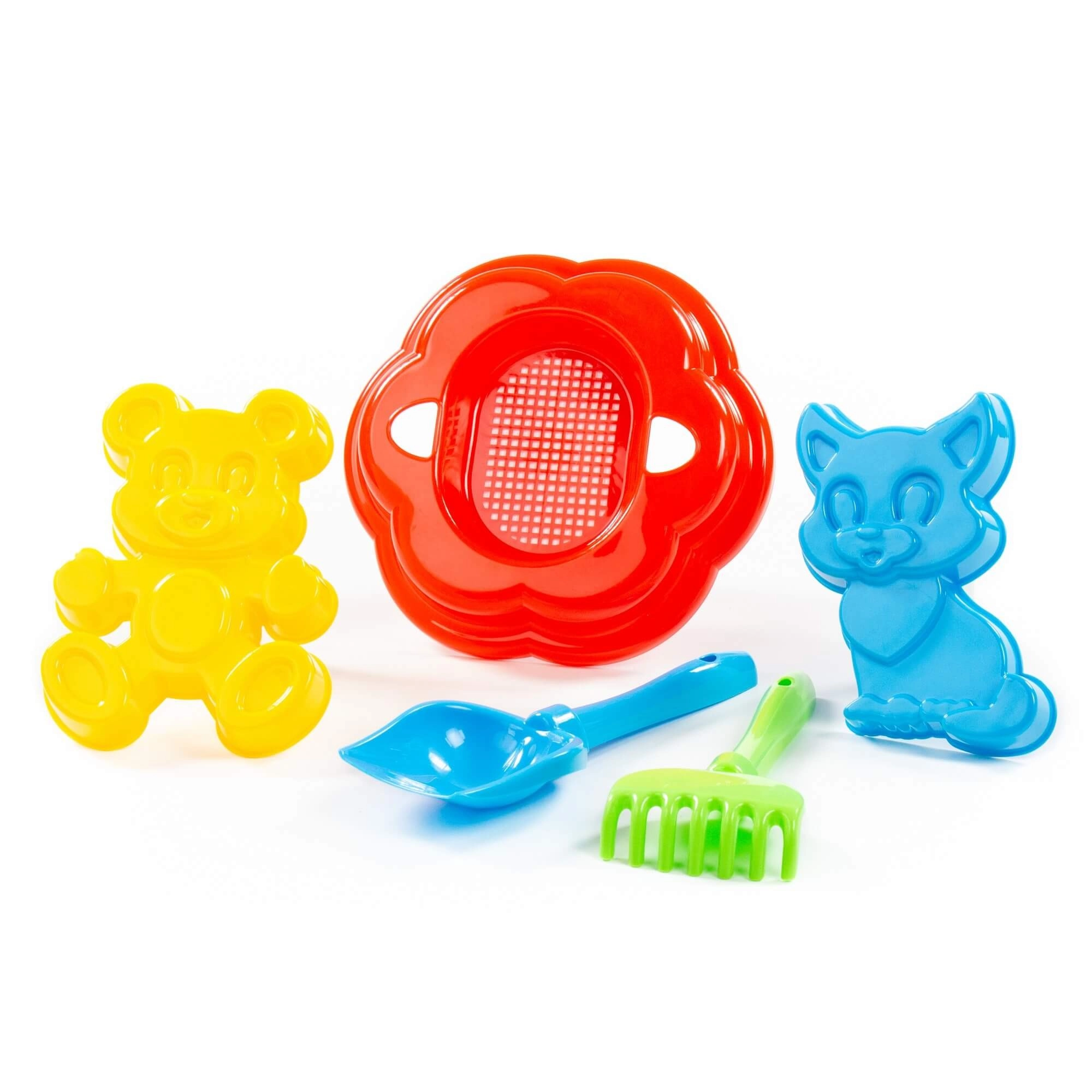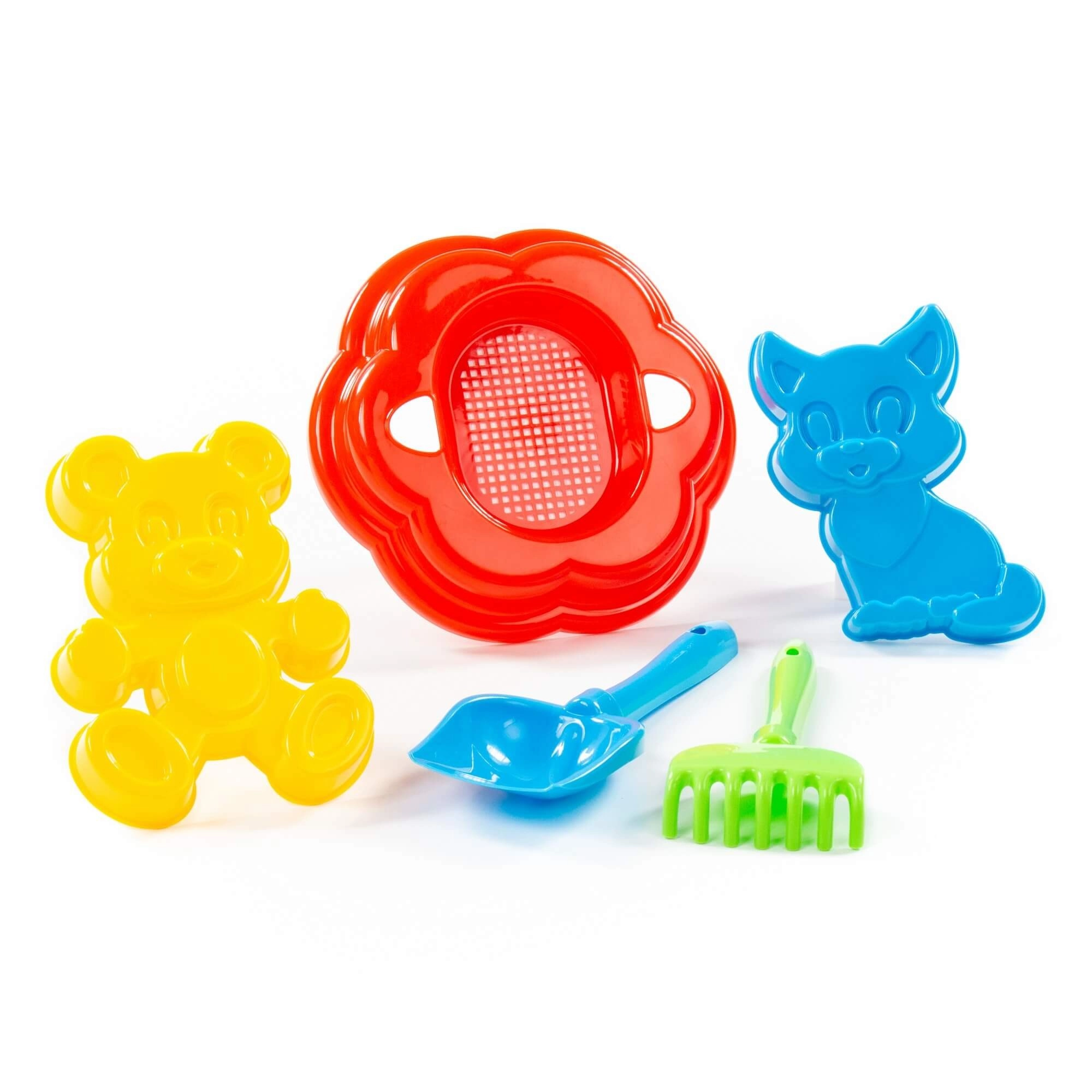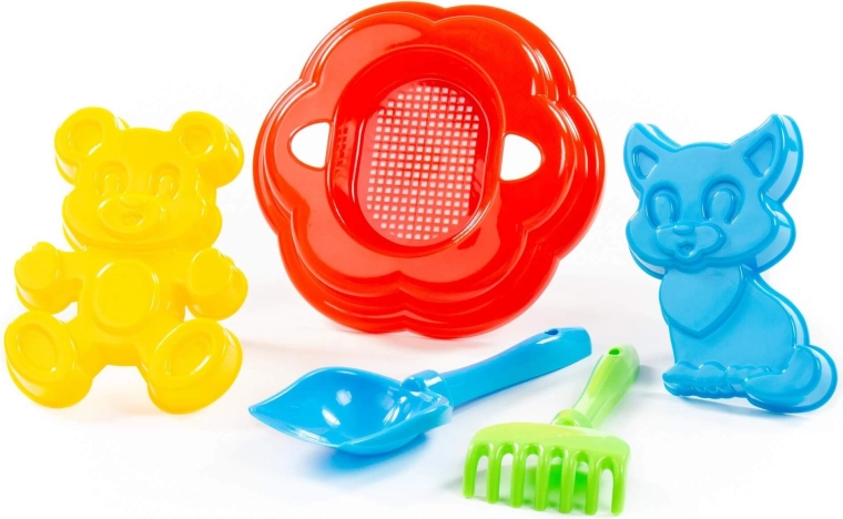 Inhoud van de set: grote bloemvormige zeef met handgrepen, schep, hark en twee vormpjes (kitten en beertje). De set ondersteunt fijne motoriek, creativiteit en spelen in de buitenlucht. Kleuren variëren; een specifieke kleur kiezen is niet mogelijk – wordt willekeurig verzonden afhankelijk van beschikbaarheid.