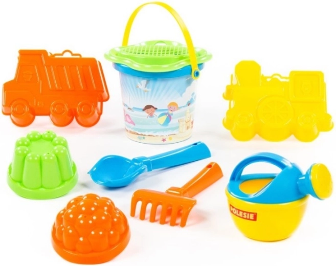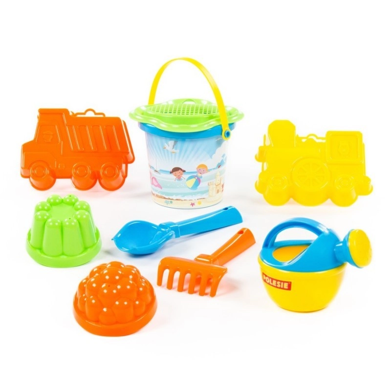 Deze veelzijdige zandset is ideaal voor buitenspelen. Het kleine emmertje met een bloemvormig zeefje helpt zand eenvoudig te zeven, terwijl het schepje, harkje en de gieter de speelmogelijkheden vergroten. Vier vormpjes in verschillende vormen (waaronder een autootje en een treintje) inspireren kinderen tot het maken van originele creaties.