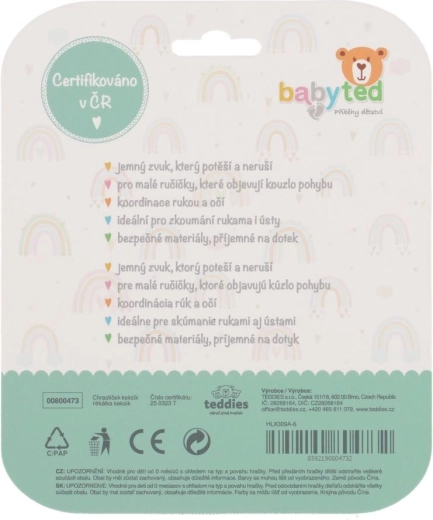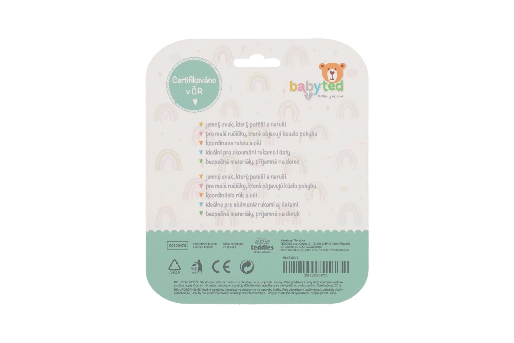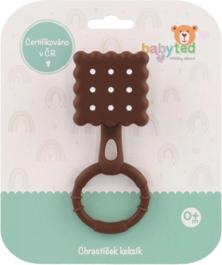De schattige bijtring en rammelaar in de vorm van een koekje van BabyTed is het ideale eerste speeltje voor baby’s vanaf de geboorte. Zacht silicone masseert het tandvlees zachtjes tijdens het doorkomen van de eerste tandjes, terwijl de praktische ring het vasthouden met kleine handjes vergemakkelijkt. De lichte constructie ondersteunt de fijne motoriek en het zachte gerammel stimuleert het gehoor. Veilige uitvoering en hoogwaardige afwerking, gecertificeerd in Tsjechië.