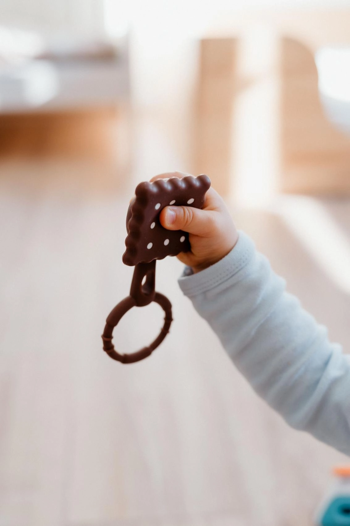 Het originele ‘koekjes’-design wekt nieuwsgierigheid, zacht en flexibel silicone voelt prettig aan en is zacht voor gevoelig tandvlees. Het zachte gerammel ondersteunt de geluidswaarneming zonder storend lawaai. Het getextureerde oppervlak helpt het tandvlees te masseren en draagt bij aan natuurlijke kalmering van de baby.