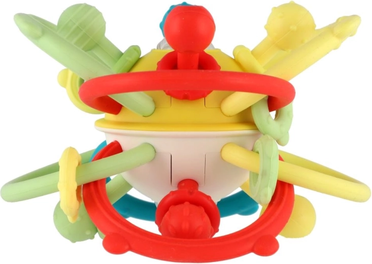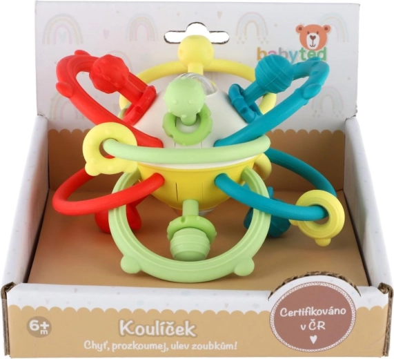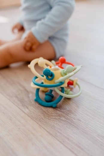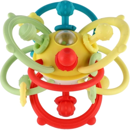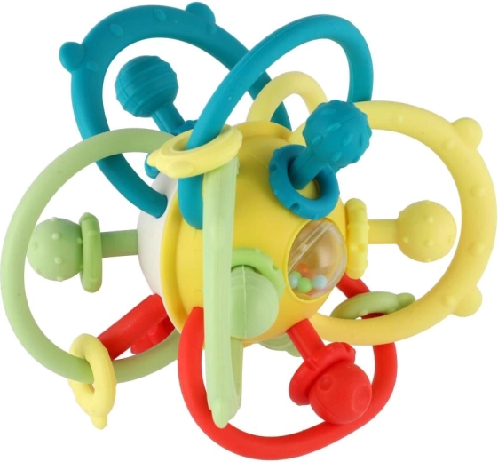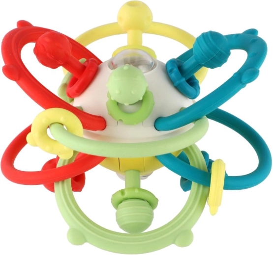 Het transparante middendeel met gekleurde kraaltjes zorgt voor een zacht geluid dat het gehoor prikkelt en aanzet tot actieve beweging – schudden, van hand tot hand doorgeven en rollen over het oppervlak. Het speeltje is ontworpen voor de ontwikkeling van de fijne motoriek, oog-handcoördinatie en zintuiglijke stimulatie vanaf 6 maanden.