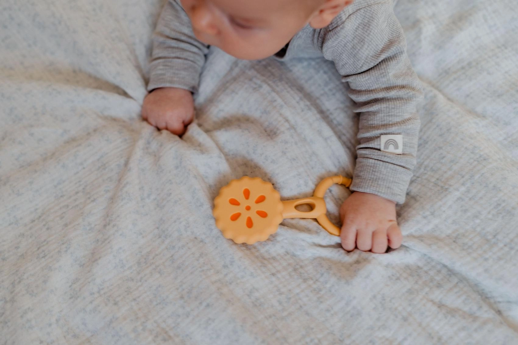 De getextureerde ring ligt goed in de hand, ook bij kleine handjes, en ondersteunt de ontwikkeling van de fijne motoriek.
