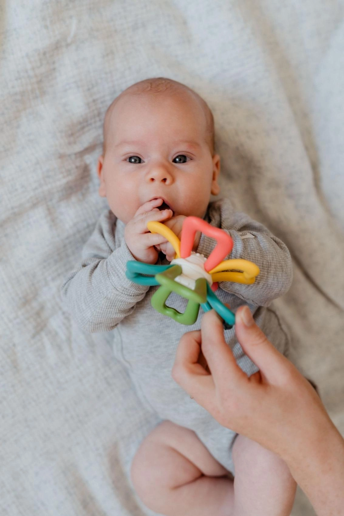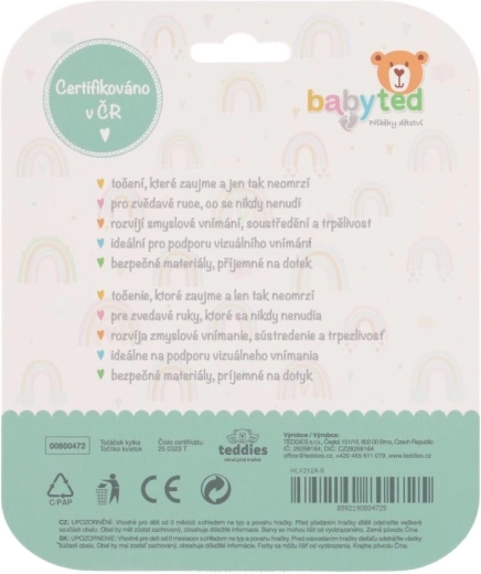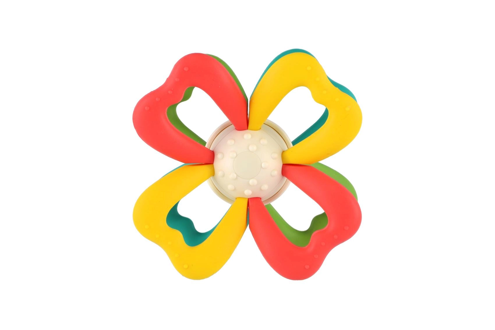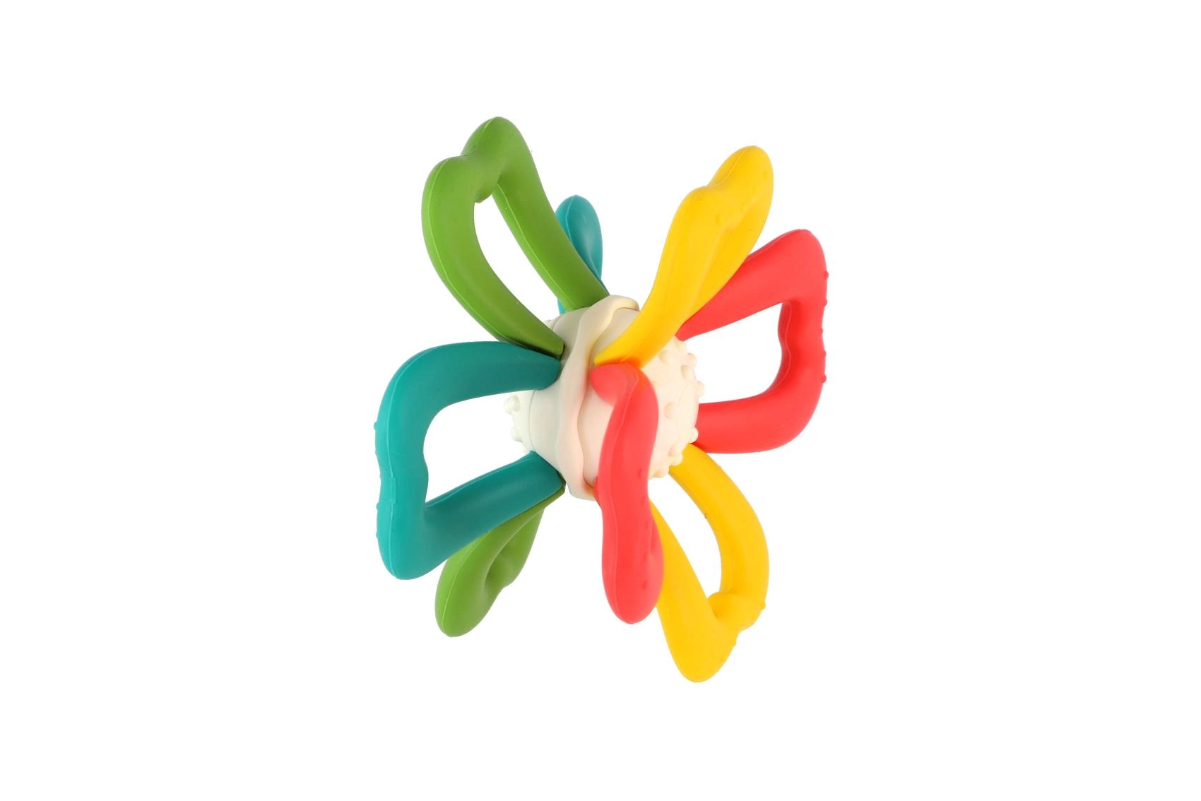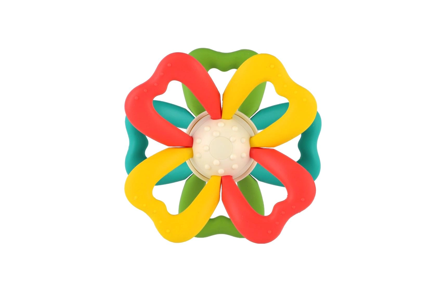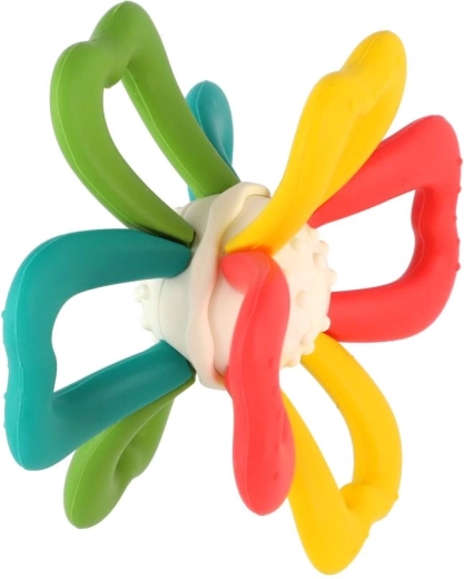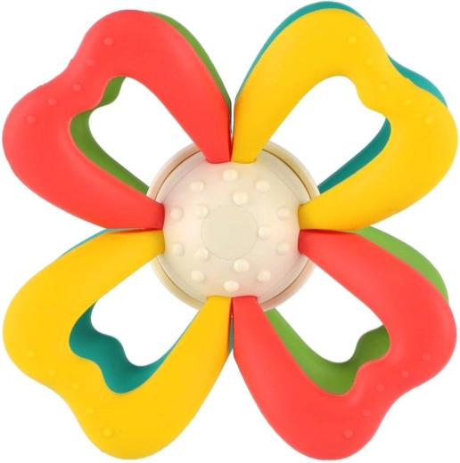 Het middendeel van het speeltje kan worden gedraaid, wat op natuurlijke wijze de oog-handcoördinatie traint en uitnodigt tot verder ontdekken. Dankzij de lichte constructie van siliconen en duurzaam kunststof is het veilig, eenvoudig schoon te maken en ideaal voor dagelijks gebruik.