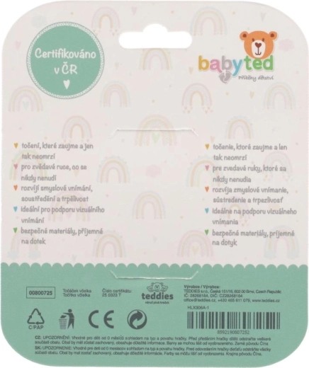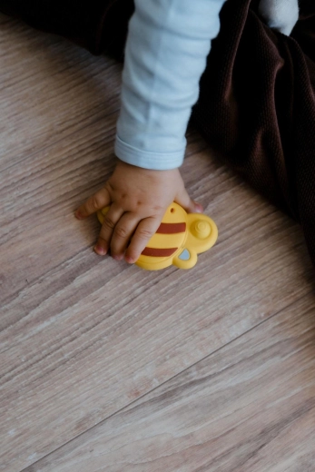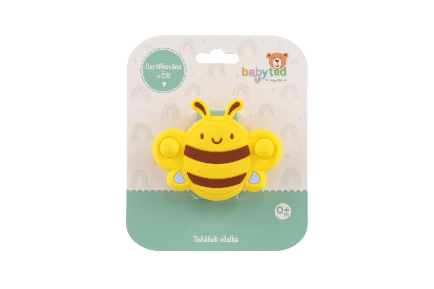 De combinatie van zacht siliconen en duurzaam kunststof biedt diverse zintuiglijke prikkels – van fijne texturen tot licht draaien en knijpen. De bij is ook een uitstekende keuze als bijtring tijdens het doorkomen van de eerste tandjes. Certificering in Tsjechië garandeert geteste kwaliteit en veiligheid.