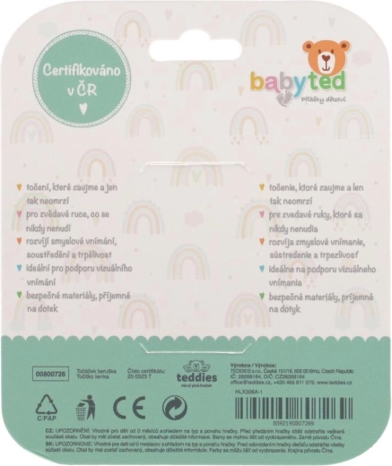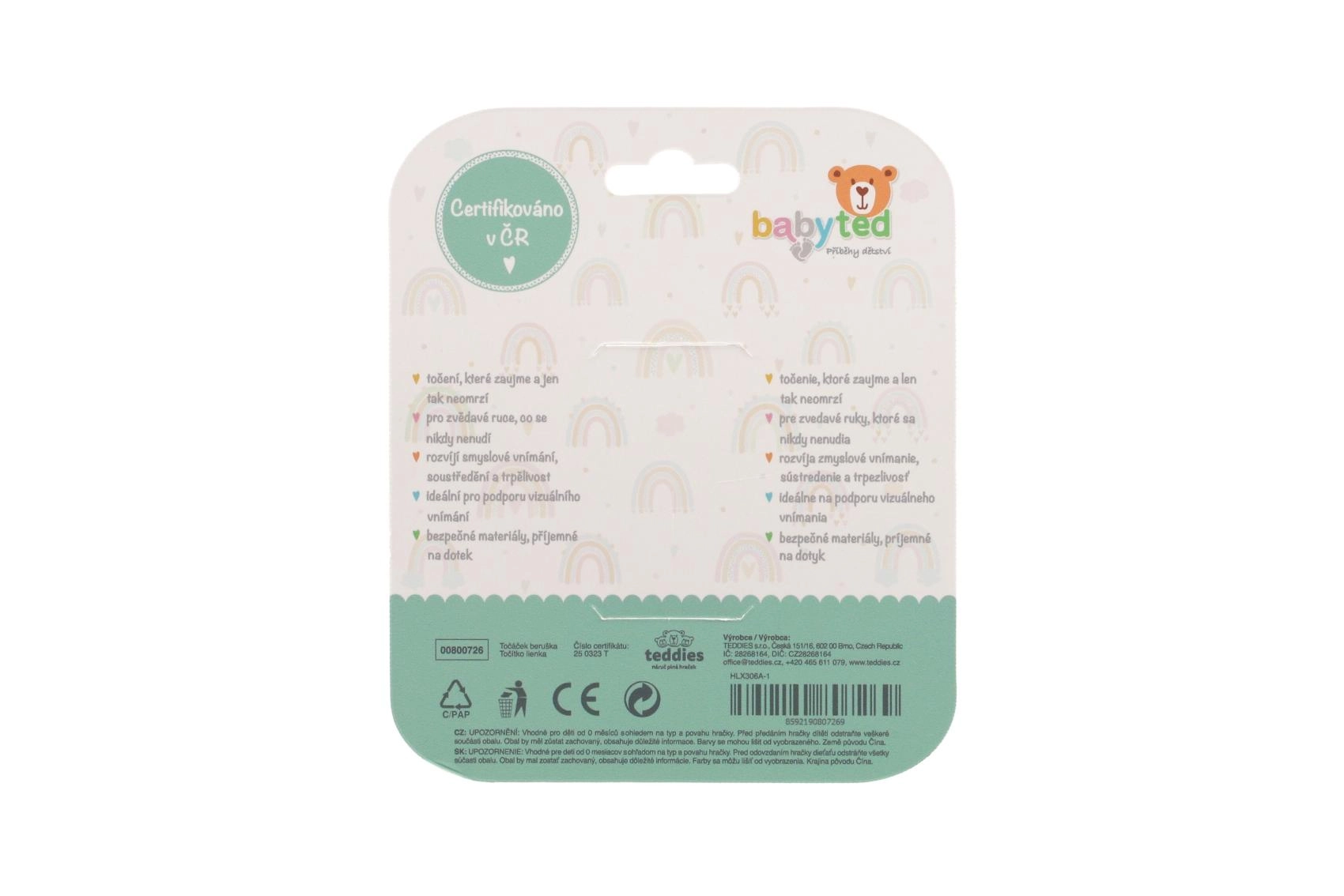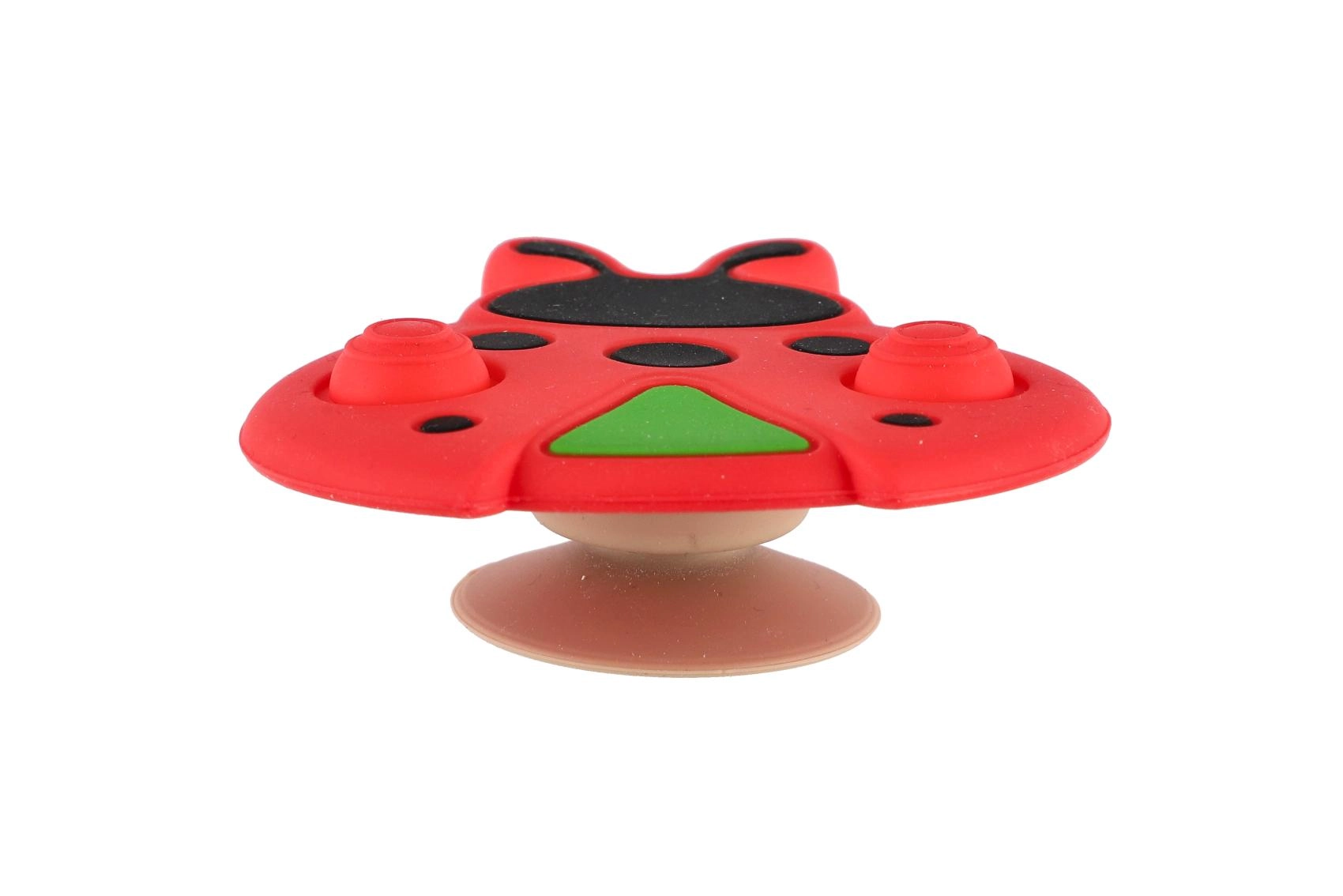 Het draaiende midden en de haptische elementen (bubbels, uitstulpingen) nodigen uit om te drukken, draaien en ontdekken, en ontwikkelen zo op een natuurlijke manier de coördinatieve vaardigheden, de grijpbeweging en de fijne motoriek. Het contrasterende rood met zwarte stippen en een groene detail ondersteunt het visuele waarnemen en houdt de aandacht van het kind vast.