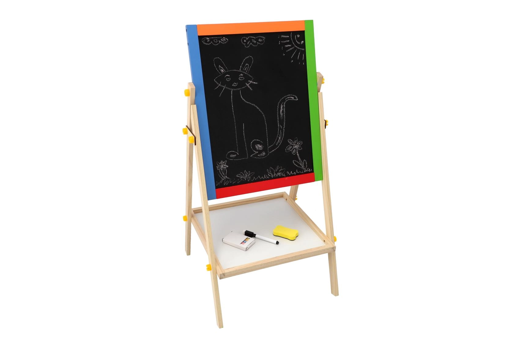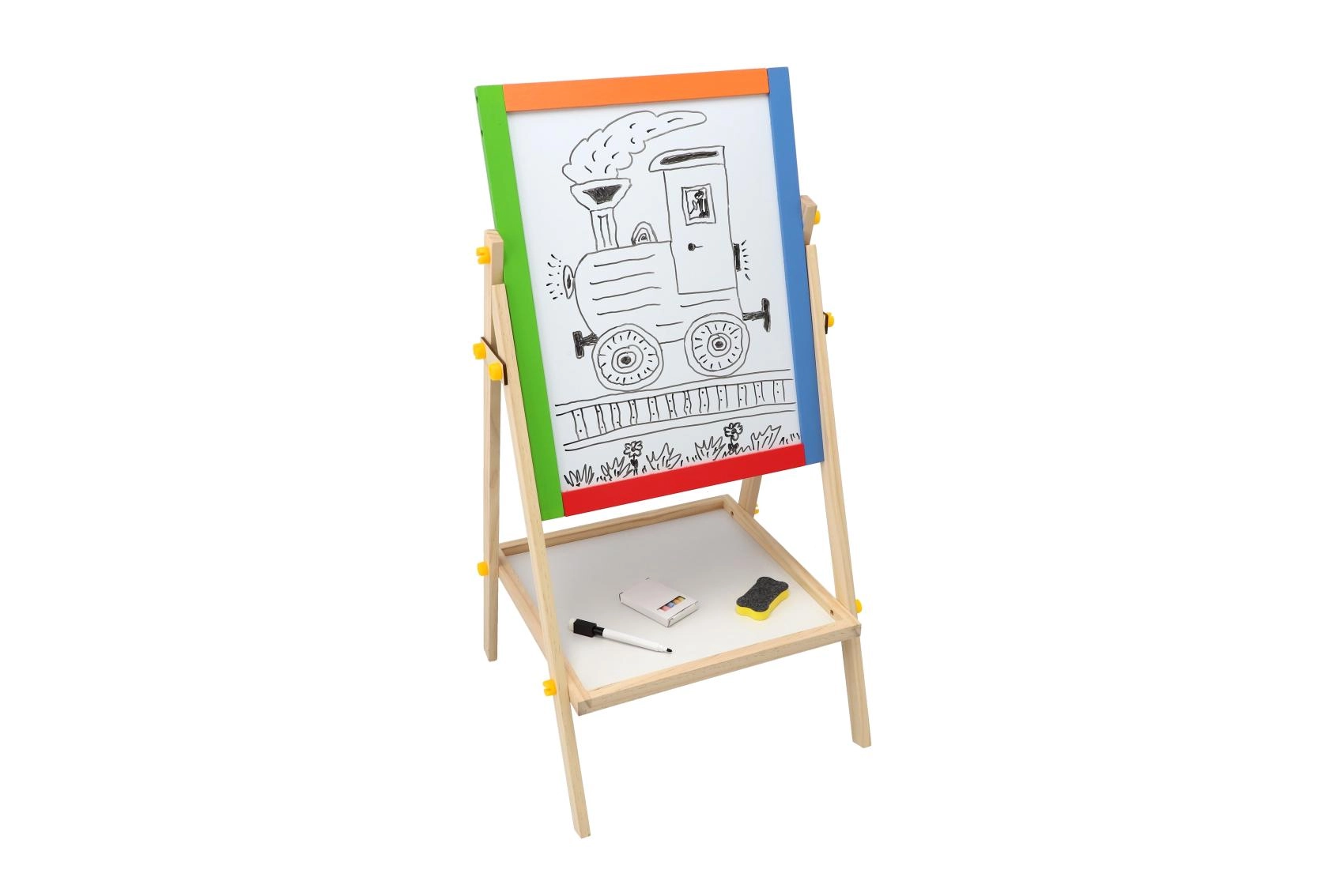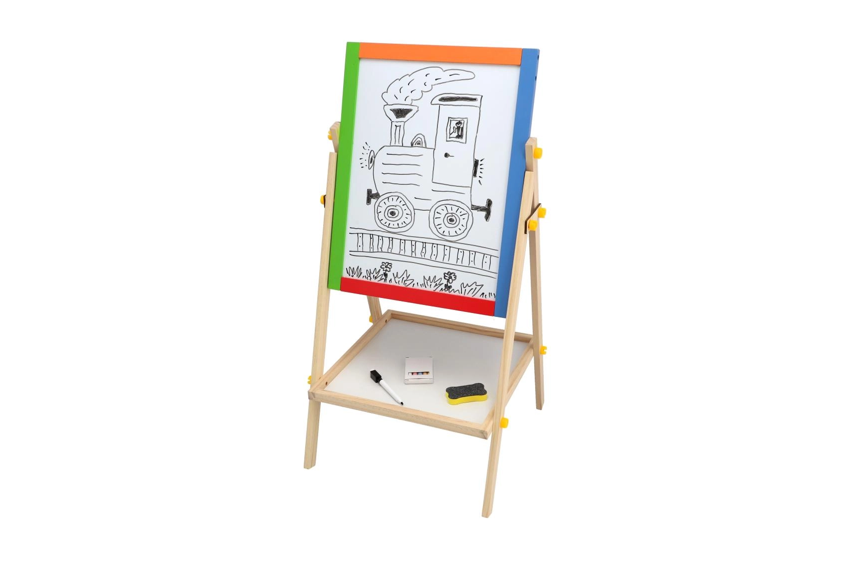 Dit dubbelzijdige bord stimuleert creativiteit, fijne motoriek en eerste schoolvaardigheden. Kinderen kunnen afwisselen tussen tekenen met krijt en schrijven met stift, letters leren met magneetjes en rekenen oefenen – allemaal op één plek.