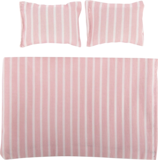 Het tweepersoonsbed met een doorlopend dekbed, kussens en twee kleedjes creëert een comfortabele plek voor poppen om uit te rusten en geeft het huisje een authentieke sfeer.