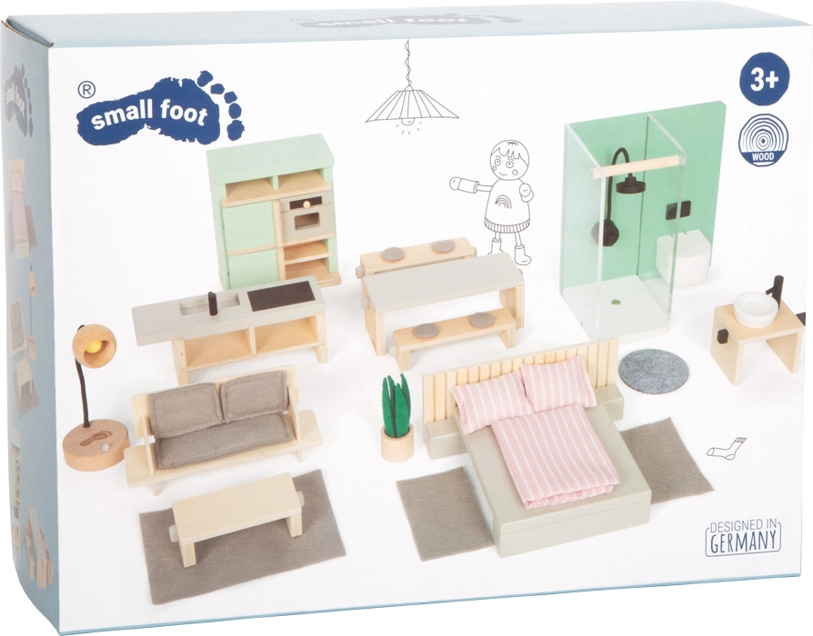 Verander het poppenhuis in een modern en gezellig thuis met deze complete set van Small Foot. De set omvat inrichting voor slaapkamer, badkamer, keuken, eetkamer en woonkamer in Scandinavische stijl. Kinderen zullen dol zijn op het natuurlijke hout, de zachte pasteltinten, de moderne details en de mogelijkheid tot rollenspel met poppen tot 12 cm.
