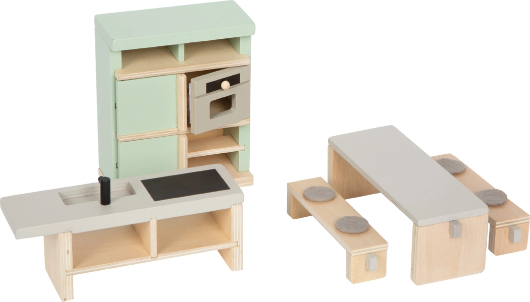 Het Scandinavische design met een hoog aandeel natuurlijk hout en zachte kleuren ondersteunt een harmonieuze uitstraling van elk poppenhuis. Dankzij de robuuste materialen (hout, metaal, stof, vilt) is de set geschikt voor dagelijks spelen en stimuleert deze de verbeelding, fijne motoriek en sociale vaardigheden.