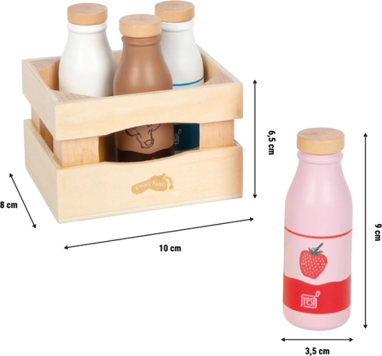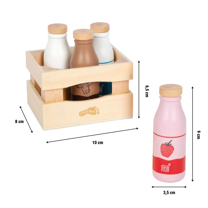 Geef kinderen nog meer plezier bij het winkeltje spelen en koken met deze kwalitatieve houten krat met vier flessen melkdranken. De set bevat klassieke melk, haverdrank, aardbeimelk en chocolademelk. Dankzij de heldere kleuren en eenvoudige symbolen zijn de soorten gemakkelijk te herkennen, ook voor jongere kinderen. De duurzame houten constructie en de praktische krat maken opbergen eenvoudig en houden het speelgebied netjes.