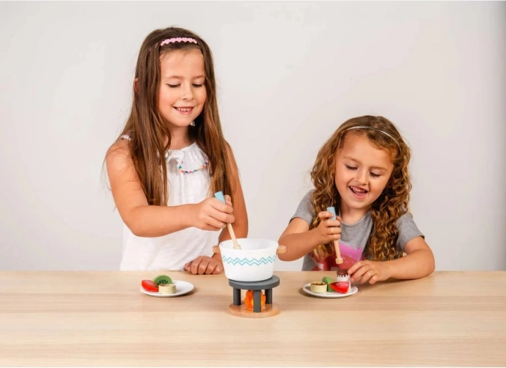 De houten fondueset met chocolade biedt kinderen een authentieke ervaring van thuiskeuken of café. Dankzij de zorgvuldige afwerking en gladde oppervlakken is het spel prettig en veilig, terwijl de rijke accessoires uitnodigen om eigen verhalen en recepten te creëren.