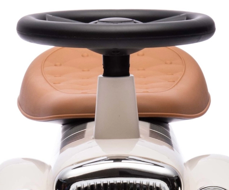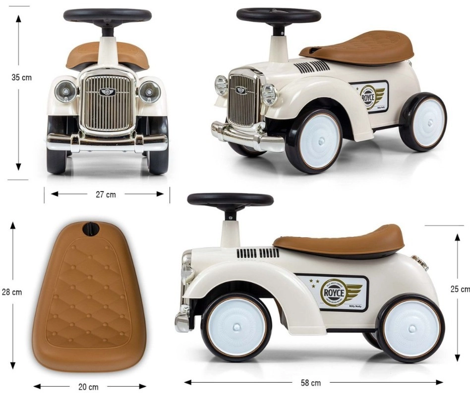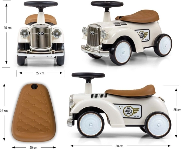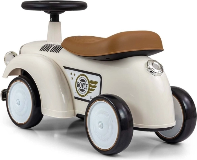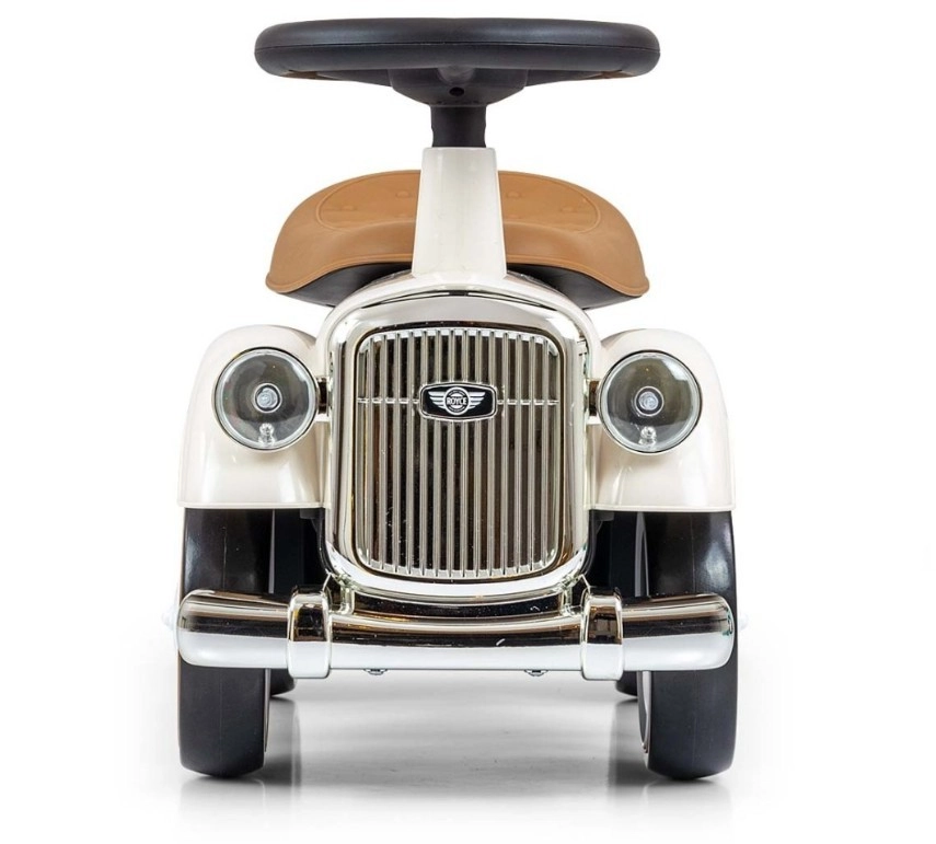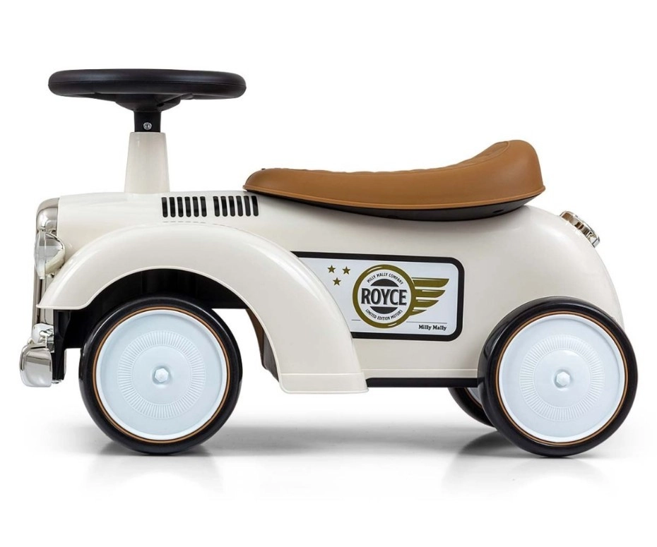 De loopfiets Royce valt op door zijn vintage uitstraling met verchroomde details en het ROYCE-embleem, wat hem een prestigieus karakter geeft. Dankzij de brede en stabiele wielen en de prettig gevormde zitting is hij ideaal als eerste voertuig voor kinderen die al zelfstandig kunnen zitten. Het draaibare stuur maakt gemakkelijk manoeuvreren mogelijk, zowel binnen als tijdens een wandeling.