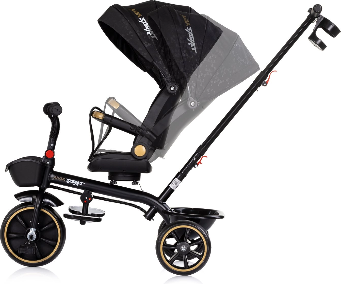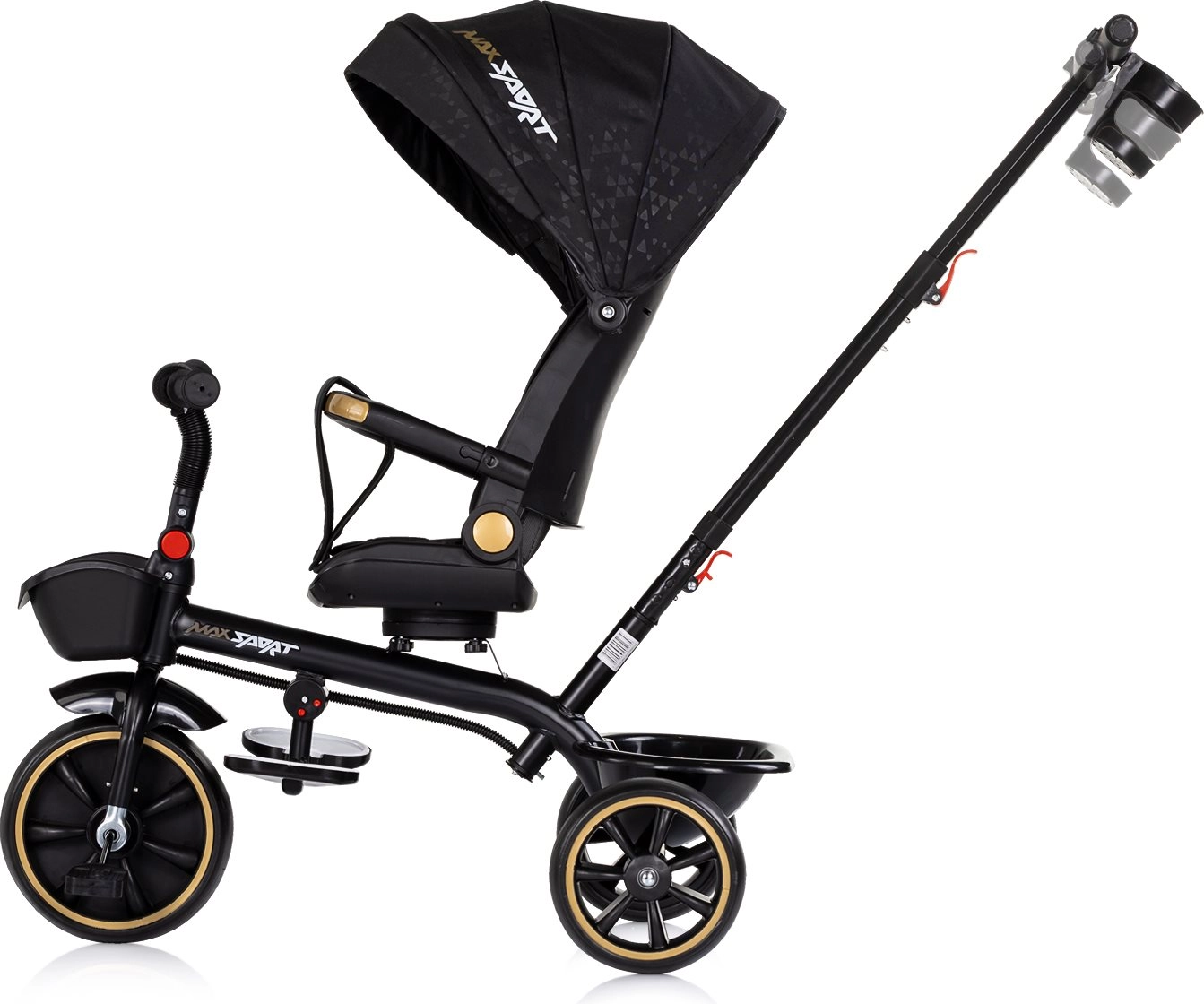 De praktische uitrusting omvat een verstelbare ouderduwstang (2 hoogtes), een inklapbare kap met zonneklep, neerklapbare en beweeglijke voetsteunen en twee mandjes voor kleinigheden. De driewieler is vervaardigd volgens de Europese veiligheidsnormen voor speelgoed, zodat je elke rit met een gerust gevoel kunt beleven.