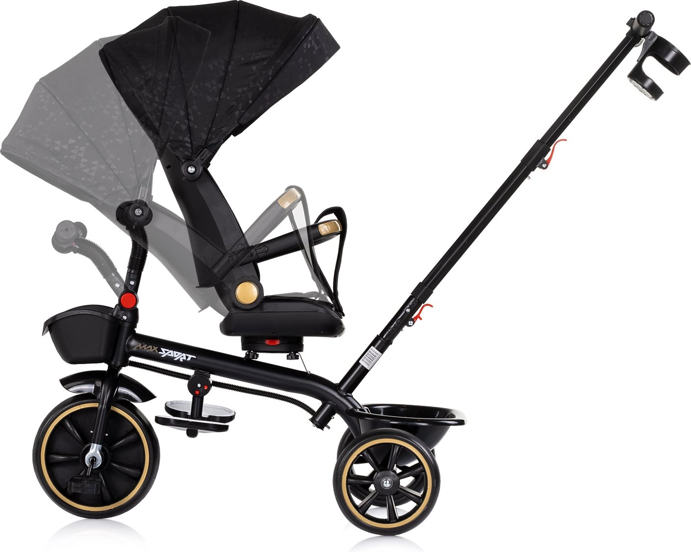 Schakel eenvoudig van oudergeleide modus naar zelfstandig rijden. De afneembare kap, duwstang en bumper maken het mogelijk de driewieler aan te passen aan de leeftijd en vaardigheden van het kind.