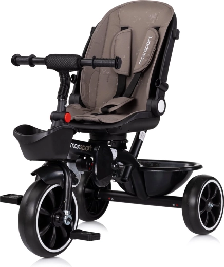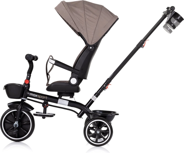 De doordachte ergonomie omvat een brede, zachte, gevoerde zitting, verstelling en 360° draai voor gemakkelijk instappen en wisselen van richting. Inklapbare voetsteunen bieden comfort, terwijl de veiligheidsriem voor zekerheid zorgt. Praktische extra’s zoals een bekerhouder en mandje voor en mand achter zijn handig voor speelgoed en kleine spulletjes.