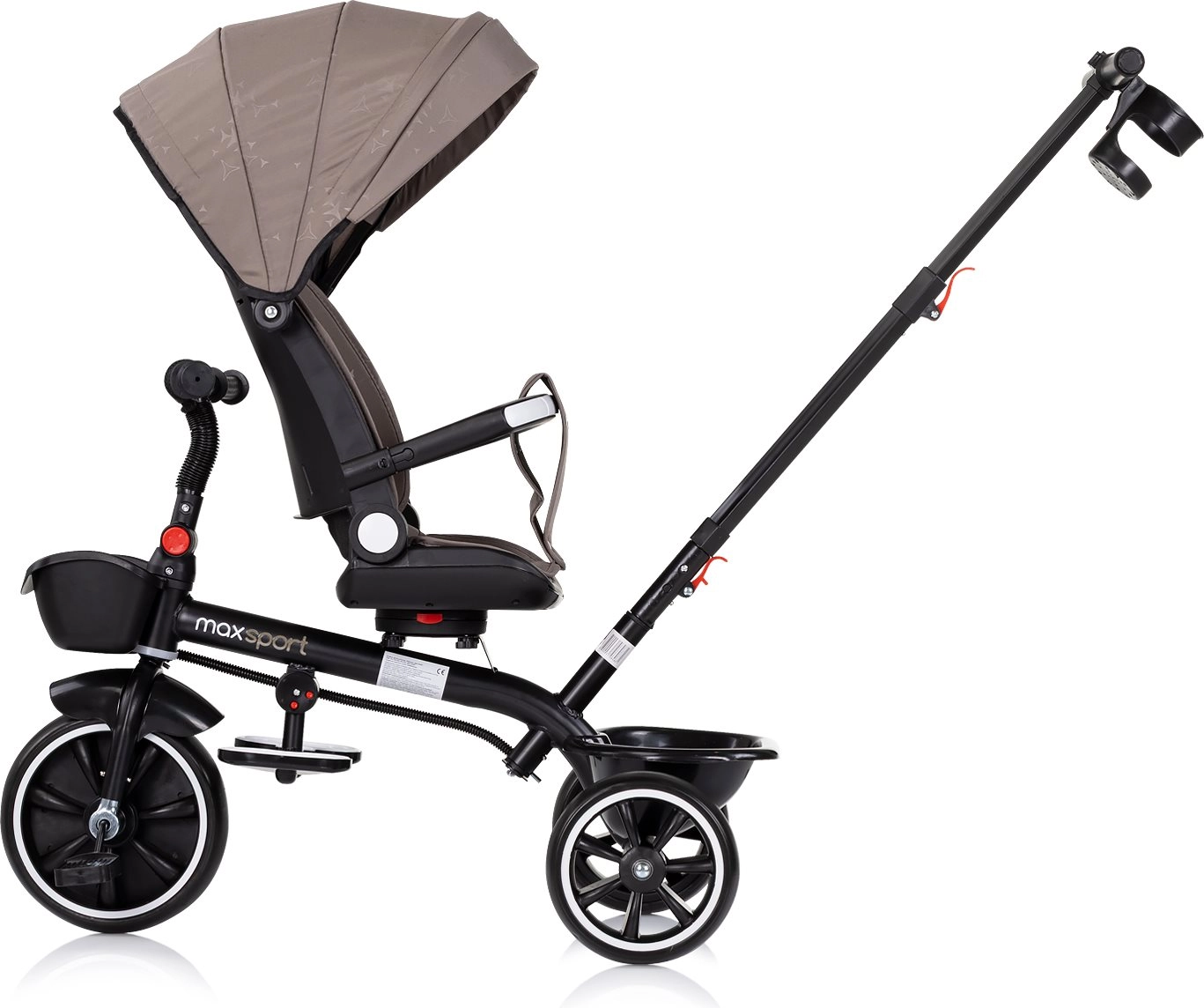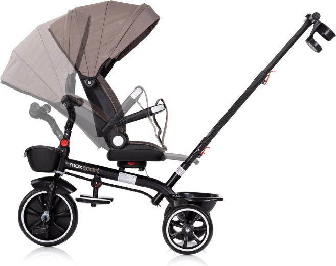 Eenvoudig instappen en van rijrichting veranderen dankzij de draaibare zitting. Met bekerhouder en opbergmanden voor en achter, plus een inklapbare kap met zonneklep.