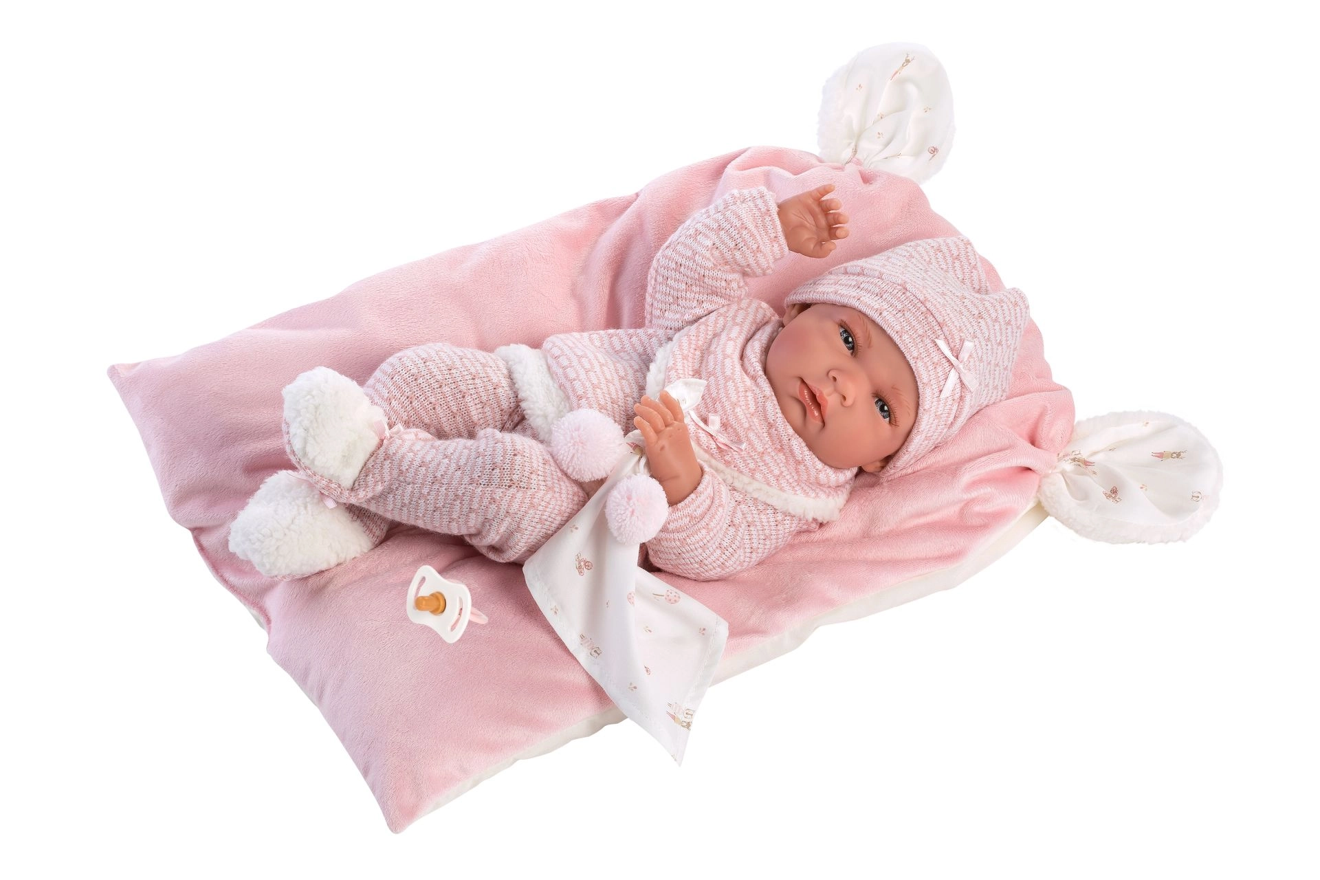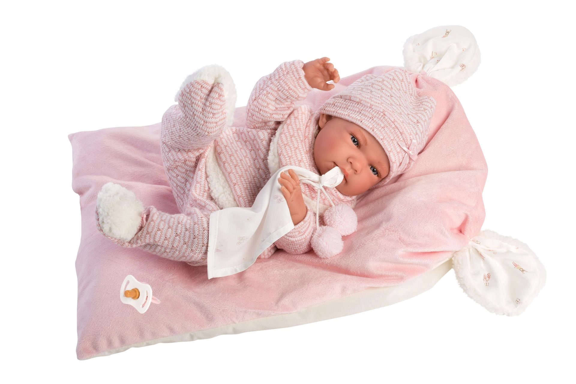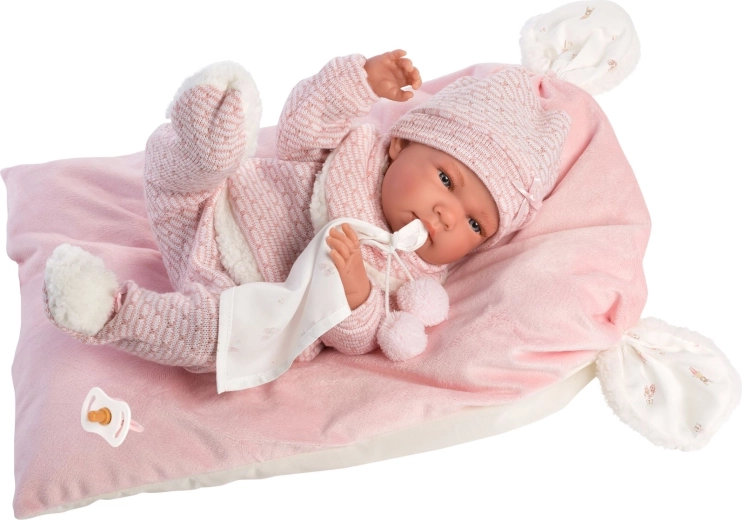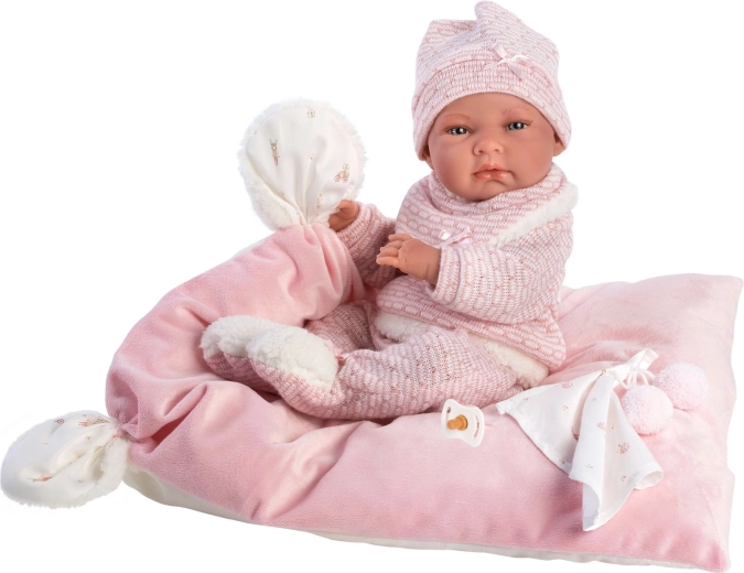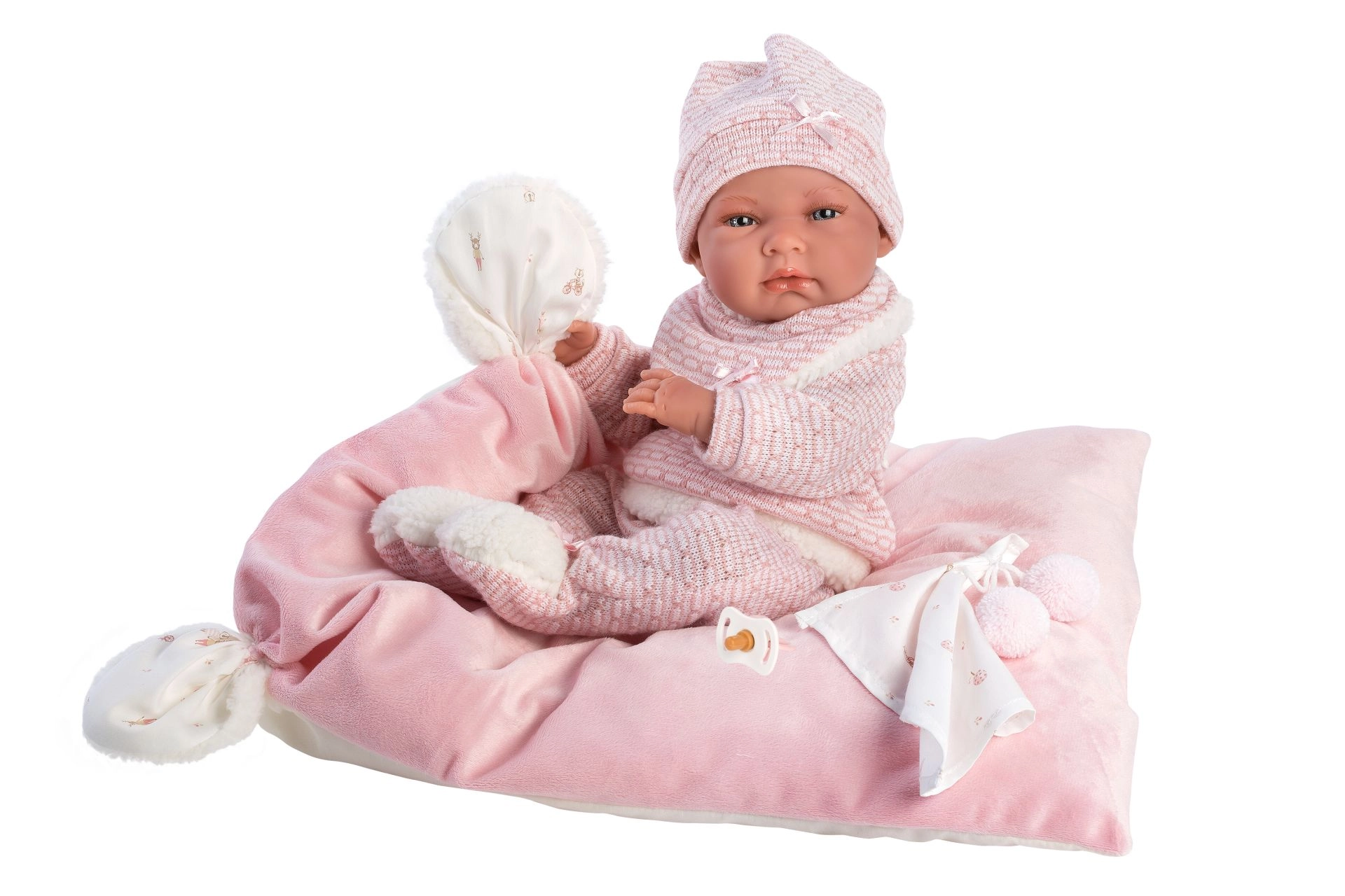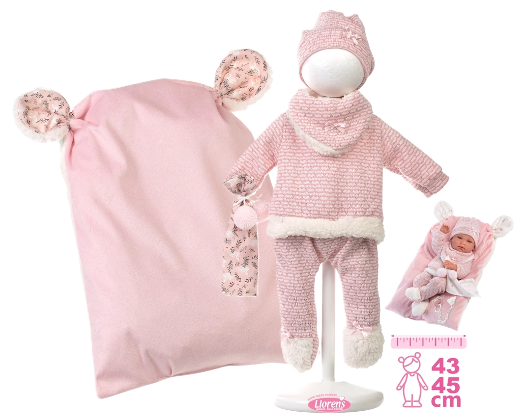Stijlvolle en warme kledingset voor de pop met alles wat jonge verzorgers nodig hebben: zachte gebreide stukken met een fijne rand, een schattig knuffeldoekje met pompons en een decoratief kussentje dat ook als comfortabel matje dient. Alles is ontworpen voor Llorens NEW BORN poppen van 40–42 cm.