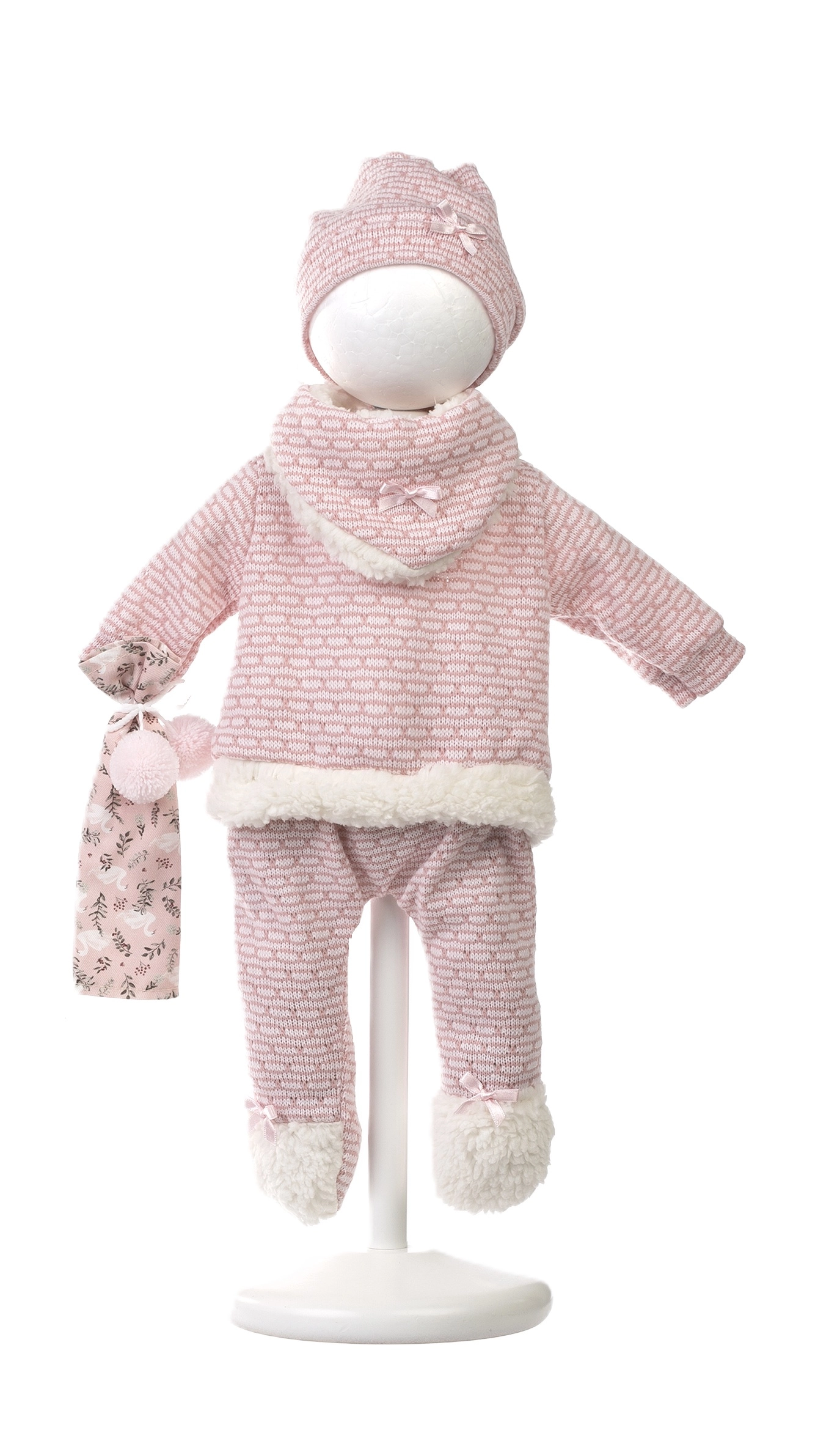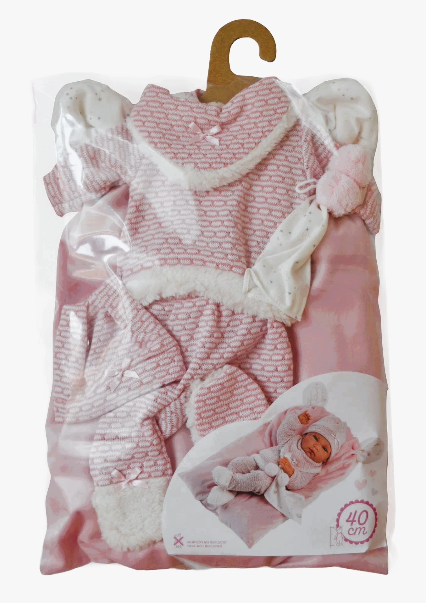 Schattige 5-delige set kleding voor de NEW BORN pop van het merk Llorens in maat 40–42 cm, met warme gebreide stukken, een knuffeldoekje met pompons en een zacht kussentje/matje. Handgemaakt in Spanje, ideaal voor verzorgend rollenspel en het ontwikkelen van de fijne motoriek. Verpakking met hangertje voor gemakkelijk opbergen.