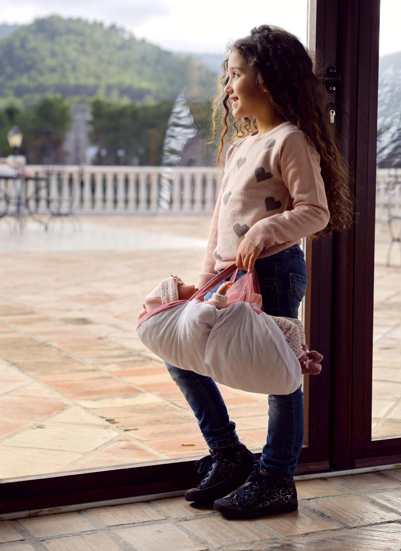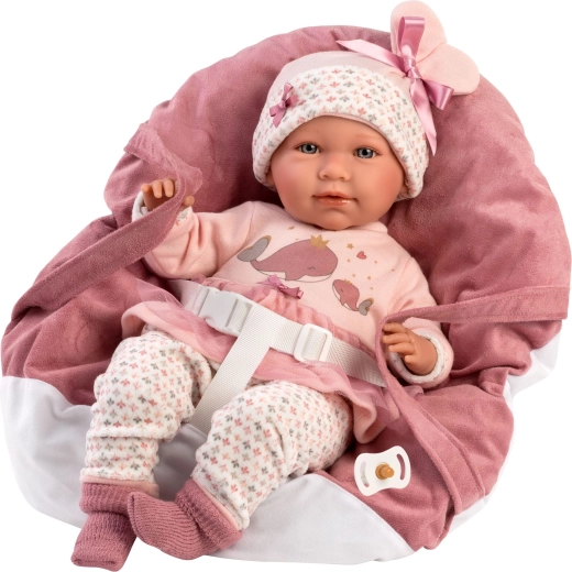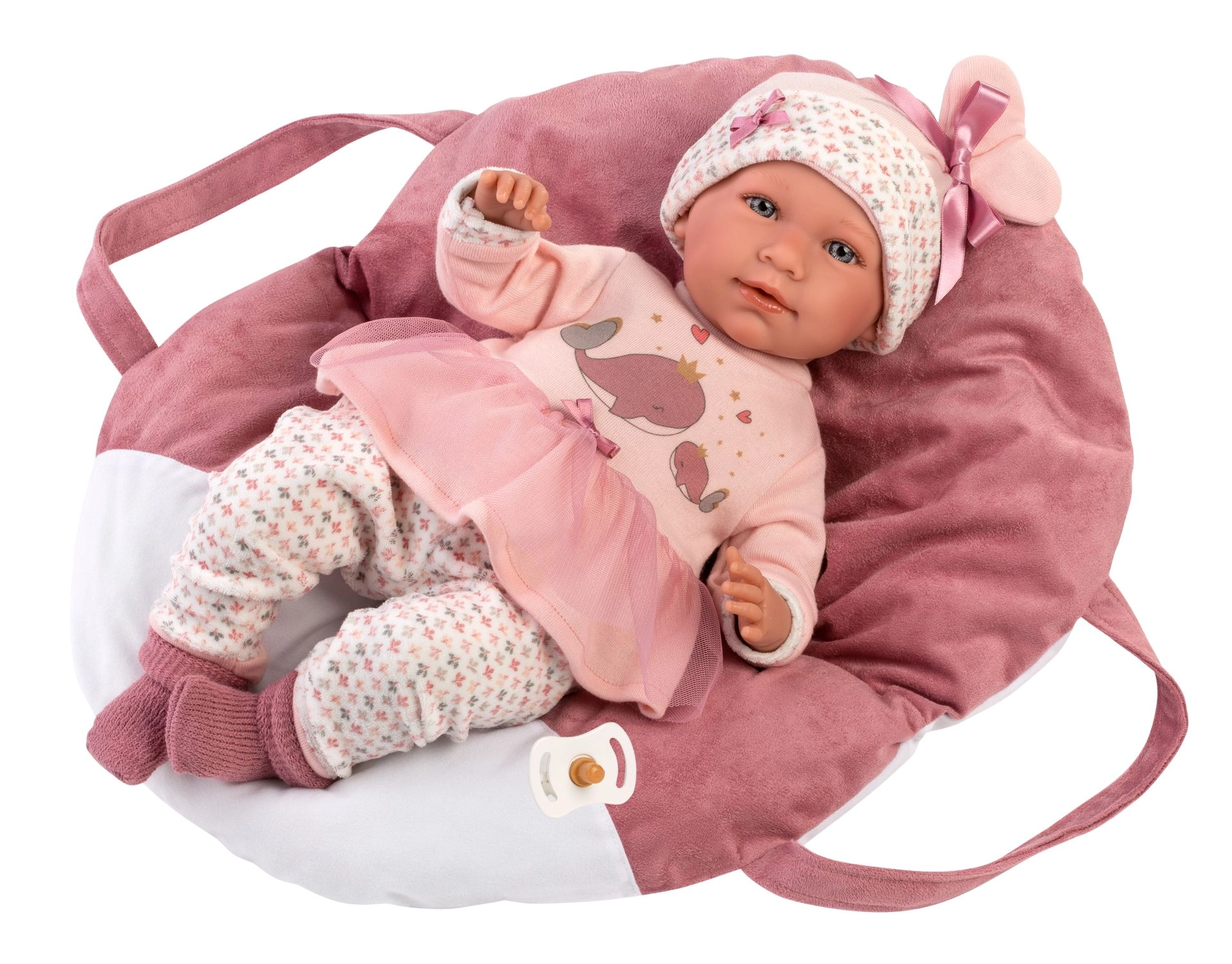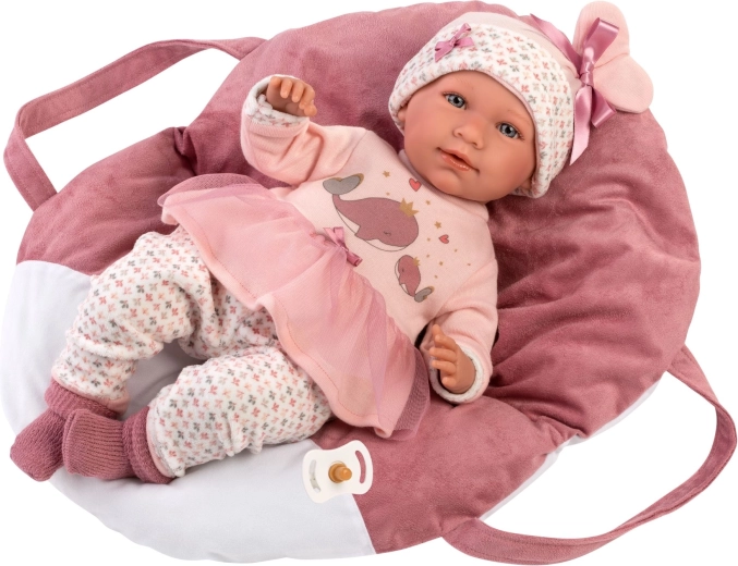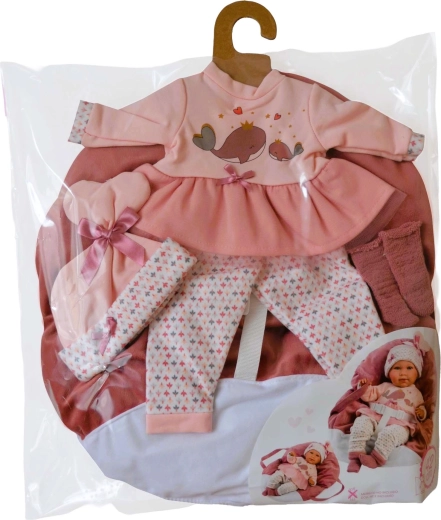 Verwen je pop met comfort en stijl. Deze 5-delige set voor NEW BORN-poppen van Llorens (40–42 cm) bevat bijpassende kleertjes in zachte roze tinten met een speels walvismotief en een heerlijk zachte draagmand/kussen met driepuntsriem. Dankzij het handwerk in Spanje kun je rekenen op zorgvuldige afwerking en prettige materialen die geschikt zijn voor kinderhanden.