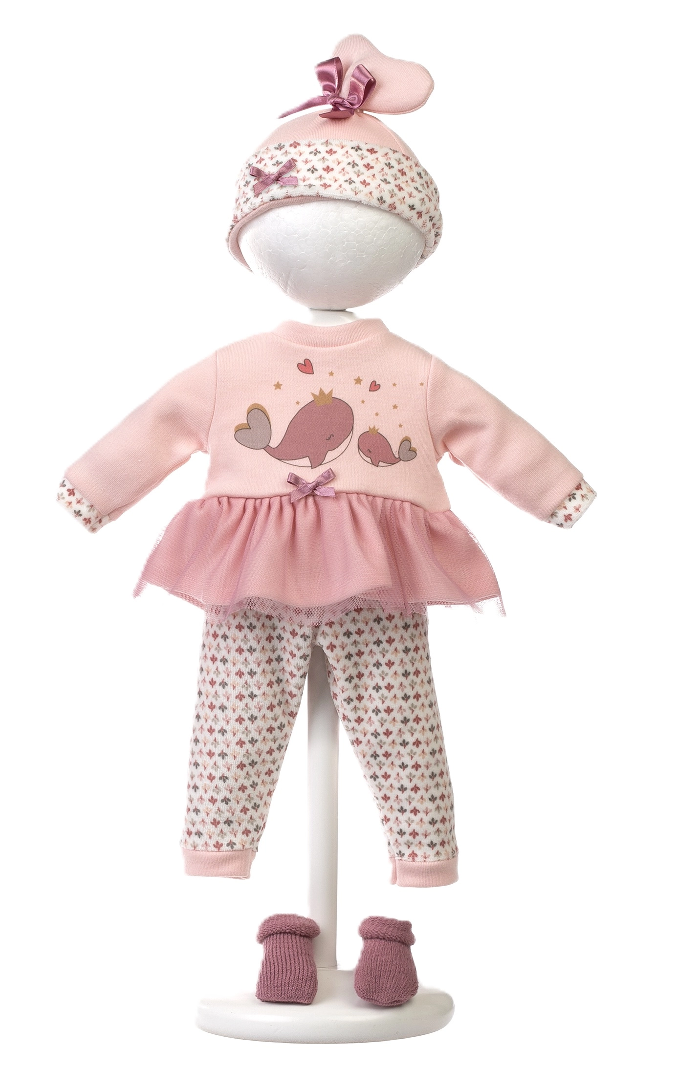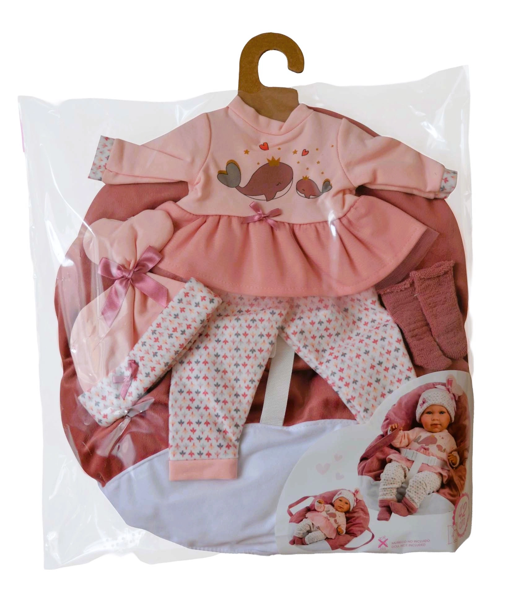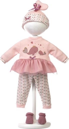 Kleed de pop van top tot teen – een roze top/jurkje met walvismotief, legging, mutsje en schoentjes aangevuld met een zachte handdraagmand.
